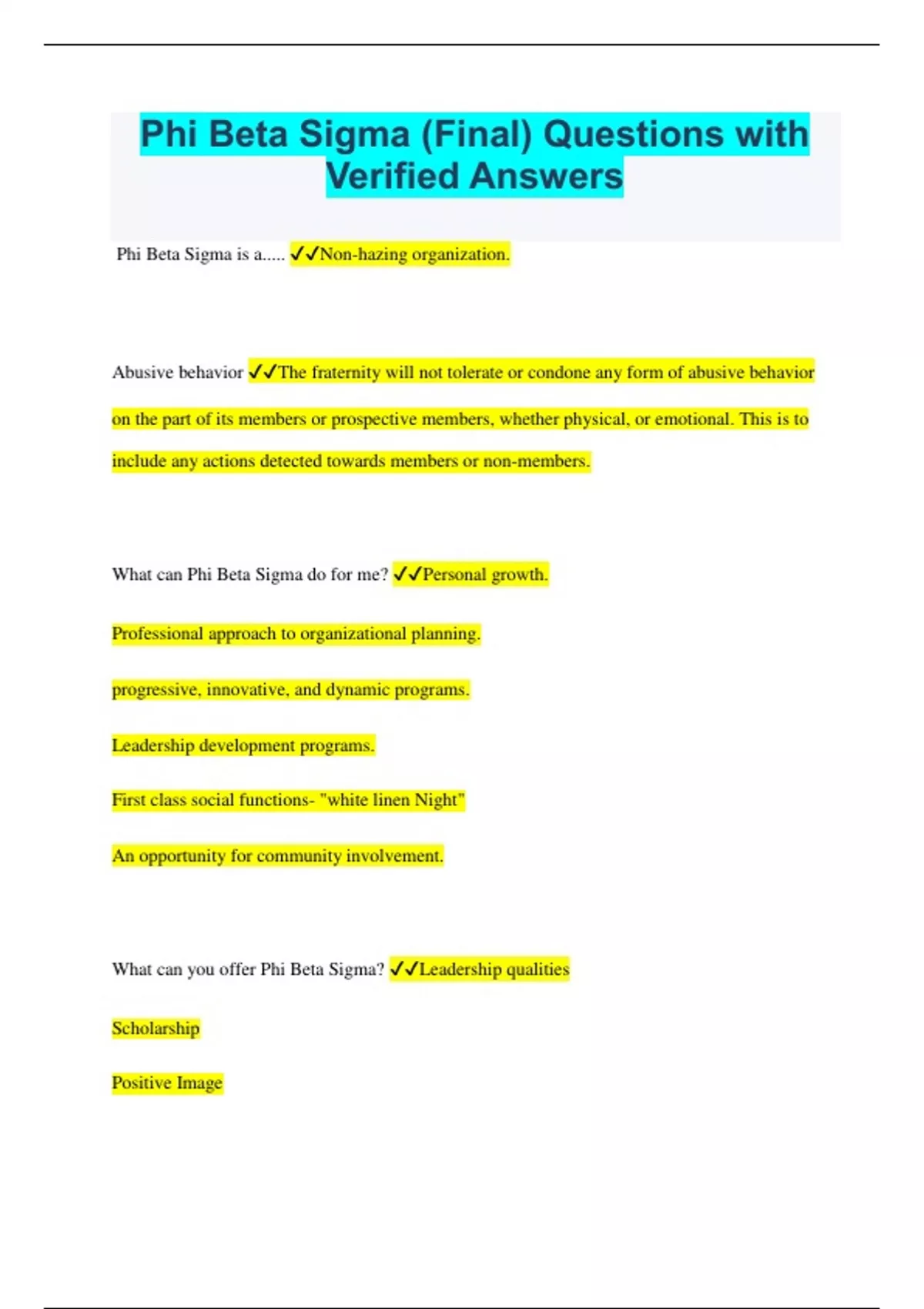 Phi Beta Sigma (Final) Questions with Verified Answers Phi Beta Sigma is a..... Non-hazing organization. Abusive behavior The fraternity will not tolerate or condone any form of abusive behavior on the part of its members or prospective members, whether physical, or emotional. This is to include any actions detected towards members or non-members. What can Phi Beta Sigma do for me? Personal growth. Professional approach to organizational planning. progressive, innovative, and dynamic programs. Leadership development programs. First class social functions- "white linen Night" An opportunity for community involvement. What can you offer Phi Beta Sigma? Leadership qualities Scholarship Positive Image Talent Sophistication Progressive Attitude When and where was Phi Beta Sigma founded? Founded January 9, 1914 at Howard University in Washington D.C. Who are "our" three founders? Honorable A. Langston Tyalor Honorable Charles I. Brown Honorable Leonard F. Morse Fraternities are for...... Men Sororities are for......... Women Fraternitas Latin word meaning the state of being brothers. Phi Beta Kappa First Greek lettered organization in America. William and Mary. Willamsburg, VA 1776 Sigma Pi Phi Oldest African American Greek Letter society. Philadelphia 1904. The Divine 9 and National Pan-Hellenic council Alpha Phi Alpha fraternity-1906-Cornell Alpha Kappa Alpha sorority-1908-Howard Kappa Alpha Psi fraternity-1911-Indiana Omega Psi Phi fraternity-1911-Howard Delta Sigma Theta sorority-1913-Howard Phi Beta Sigma fraternity-1914-Howard Zeta Phi Beta Sorority-1920-Howard Sigma Gamma Rho-1922-Butler Iota Phi Theta fraternity-1963-Morgan State National Pan-Hellenic Council founded on..... May 10, 1930. It became a perpetual body in 1937. Phi Beta Sigma came up with the idea in