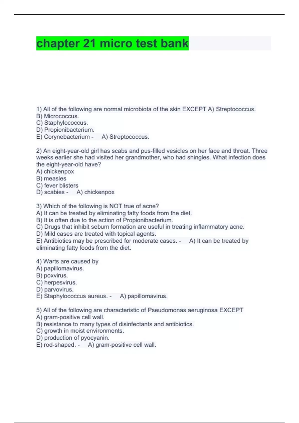 1) All of the following are normal microbiota of the skin EXCEPT A) Streptococcus. B) Micrococcus. C) Staphylococcus. D) Propionibacterium. E) Corynebacterium - A) Streptococcus. 2) An eight-year-old girl has scabs and pus-filled vesicles on her face and throat. Three weeks earlier she had visited her grandmother, who had shingles. What infection does the eight-year-old have? A) chickenpox B) measles C) fever blisters D) scabies - A) chickenpox 3) Which of the following is NOT true of acne? A) It can be treated by eliminating fatty foods from the diet. B) It is often due to the action of Propionibacterium. C) Drugs that inhibit sebum formation are useful in treating inflammatory acne. D) Mild cases are treated with topical agents. E) Antibiotics may be prescribed for moderate cases. - A) It can be treated by eliminating fatty foods from the diet. 4) Warts are caused by A) papillomavirus. B) poxvirus. C) herpesvirus. D) parvovirus. E) Staphylococcus aureus. - A) papillomavirus. 5) All of the following are characteristic of Pseudomonas aeruginosa EXCEPT A) gram-positive cell wall. B) resistance to many types of disinfectants and antibiotics. C) growth in moist environments. D) production of pyocyanin.