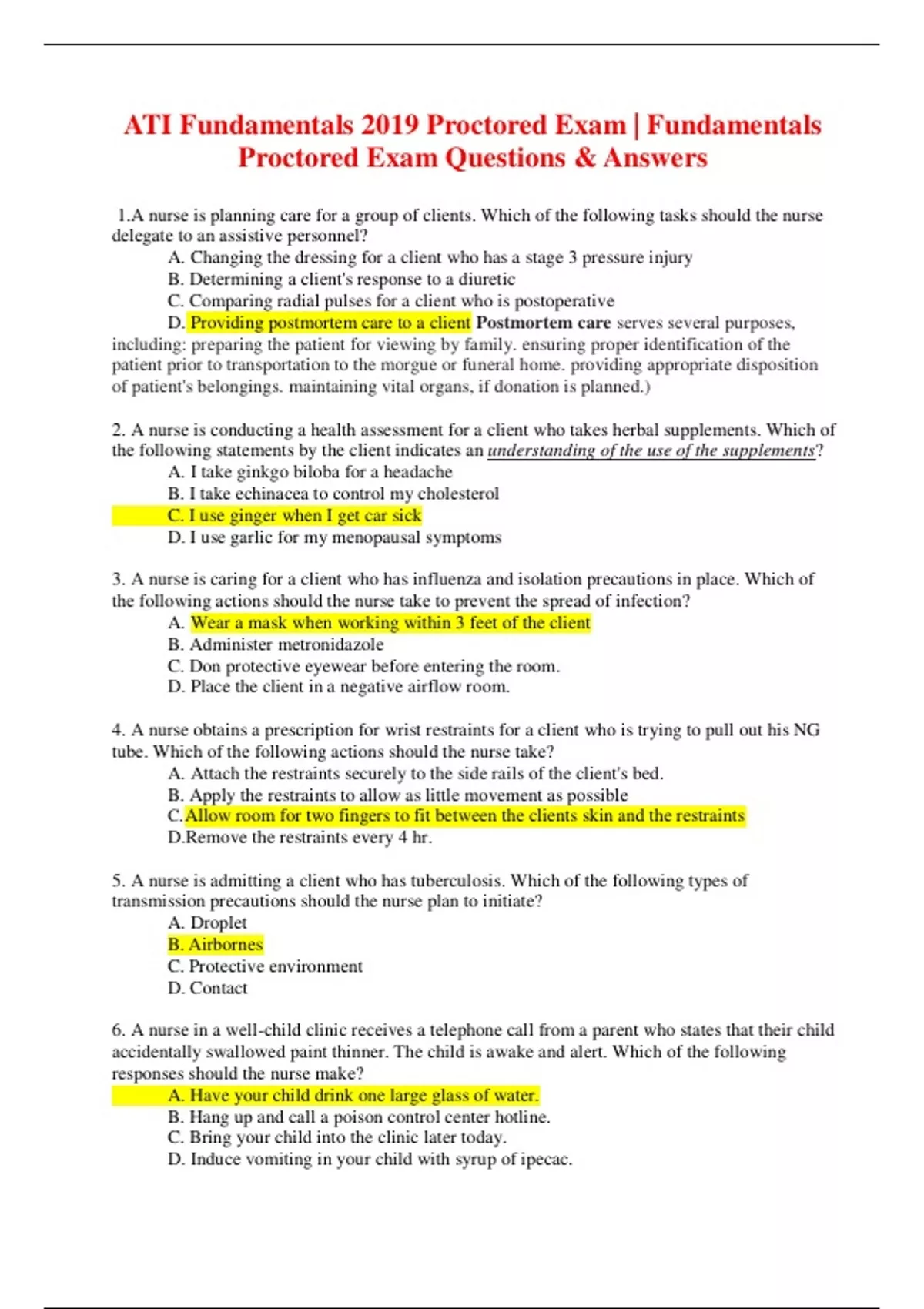 ATI Fundamentals 2019 Proctored Exam | Fundamentals Proctored Exam Questions & Answers