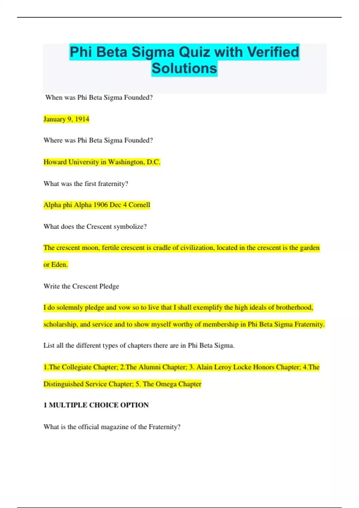 Phi Beta Sigma Quiz with Verified Solutions When was Phi Beta Sigma Founded? January 9, 1914 Where was Phi Beta Sigma Founded? Howard University in Washington, D.C. What was the first fraternity? Alpha phi Alpha 1906 Dec 4 Cornell What does the Crescent symbolize? The crescent moon, fertile crescent is cradle of civilization, located in the crescent is the garden or Eden. Write the Crescent Pledge I do solemnly pledge and vow so to live that I shall exemplify the high ideals of brotherhood, scholarship, and service and to show myself worthy of membership in Phi Beta Sigma Fraternity. List all the different types of chapters there are in Phi Beta Sigma. 1.The Collegiate Chapter; 2.The Alumni Chapter; 3. Alain Leroy Locke Honors Chapter; 4.The Distinguished Service Chapter; 5. The Omega Chapter 1 MULTIPLE CHOICE OPTION What is the official magazine of the Fraternity? The Crescent What are the Fraternity's Color? Royal Blue and Pure White What is the Fraternity flower? Carnation What is the Fraternity motto? Culture for Service and service for humanity. The Fraternity was founded upon what principles Brotherhood, Scholarships and Service Who are the founders of the Fraternity? A Langston Taylor, Leonard Francis Morse; Charles Ignatius Brown Name the international program. Bigger and Better Businesses, Education, Social Actions; Sigma Beta Club Name the organizations that comprise the National Pan Hellenic Council. Alpha Phi Alpha; Alpha Kappa Alpha; Kappa Alpha Psi; Omega Psi Phi; Delta Sigma Theta; Phi Beta Sigma; Zeta Phi Beta; Sigma Gamma Rho; Iota Phi Theta Write, in order, the 12 inch. 1. Time Value; 2.Best Performance of Duty; 3.Perseverance; 4.The Worth of Example; 5.The virtue of Patience; 6.Talent Expression; 7.Economic Wisdom; 8.The value of Character; 9.Kindly Attitudes; 10.Pleasure in work; 11.The worth of organization; 12.The Dignity of Simplicity List and describe Phi Beta Sigma's two annual observances. Founders Day (The day the fraternity ware founded and Carver Day (the day on which the pioneering botanist and educator died in 1943) Select: Ideally, the end of a tie should be: Just above waist level. 3 MULTIPLE CHOICE OPTIONS Name the founders of Zeta Phi Beta. 1.Arizona Cleaver Stemmons; 2.Myrtle Tyler Faithful; 3.Viola Tyler Goings; 4.Fannie Pettie Watts; 5.Pearl Anna Neal When was Zeta Phi Beta founded? Jan 16, 1920 Who are the elected officer of the Chapter? 1.President; 2.1st Vice President; 3.2nd Vice President; 4.Collegiate Member at Large 1; 5. Collegiate Member at Large 2; 6.Treasure; 7General Counsel; 8.Immediate Past International President; 9.Distinguished Service Chapter Rep; 10. Director of Social Actinal; 11.Director of Education; 12.Director of Bigger and Better Business; 13. Director of Collegiate Affairs; 14.Regional Directors