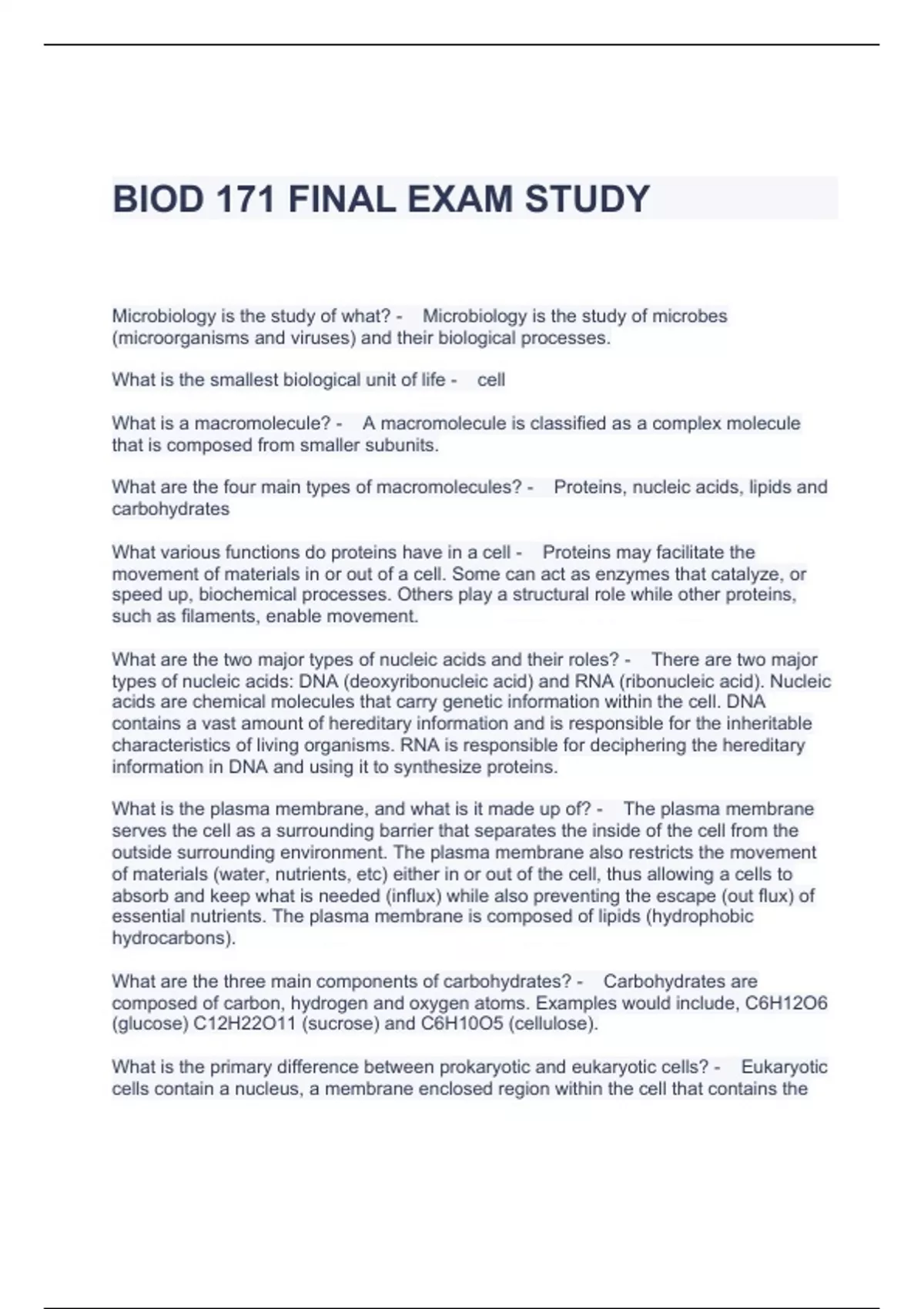 Microbiology is the study of what? - Microbiology is the study of microbes (microorganisms and viruses) and their biological processes. What is the smallest biological unit of life - cell What is a macromolecule? - A macromolecule is classified as a complex molecule that is composed from smaller subunits. What are the four main types of macromolecules? - Proteins, nucleic acids, lipids and carbohydrates What various functions do proteins have in a cell - Proteins may facilitate the movement of materials in or out of a cell. Some can act as enzymes that catalyze, or speed up, biochemical processes. Others play a structural role while other proteins, such as filaments, enable movement. What are the two major types of nucleic acids and their roles? - There are two major types of nucleic acids: DNA (deoxyribonucleic acid) and RNA (ribonucleic acid). Nucleic acids are chemical molecules that carry genetic information within the cell. DNA contains a vast amount of hereditary information and is responsible for the inheritable characteristics of living organisms. RNA is responsible for deciphering the hereditary information in DNA and using it to synthesize proteins. What is the plasma membrane, and what is it made up of? - The plasma membrane serves the cell as a surrounding barrier that separates the inside of the cell from the outside surrounding environme