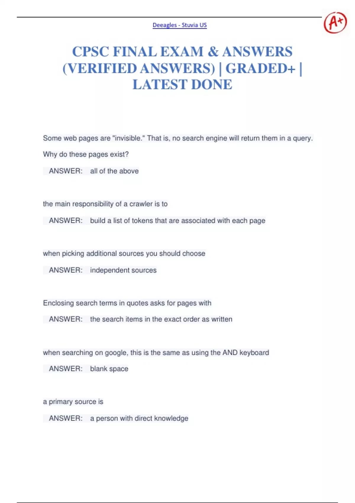 Some web pages are "invisible." That is, no search engine will return them in a query. Why do these pages exist? ANSWER: all of the above the main responsibility of a crawler is to ANSWER: build a list of tokens that are associated with each page when picking additional sources you should choose ANSWER: independent sources Enclosing search terms in quotes asks for pages with ANSWER: the search items in the exact order as written when searching on google, this is the same as using the AND keyboard ANSWER: blank space a primary source is ANSWER: a person with direct knowledge