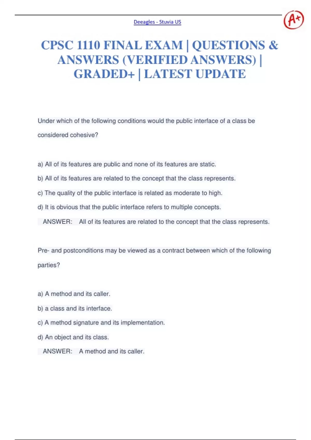 Under which of the following conditions would the public interface of a class be considered cohesive? a) All of its features are public and none of its features are static. b) All of its features are related to the concept that the class represents. c) The quality of the public interface is related as moderate to high. d) It is obvious that the public interface refers to multiple concepts. ANSWER: All of its features are related to the concept that the class represents. Pre- and postconditions may be viewed as a contract between which of the following parties? a) A method and its caller. b) a class and its interface. c) A method signature and its implementation. d) An object and its class. ANSWER: A method and its caller