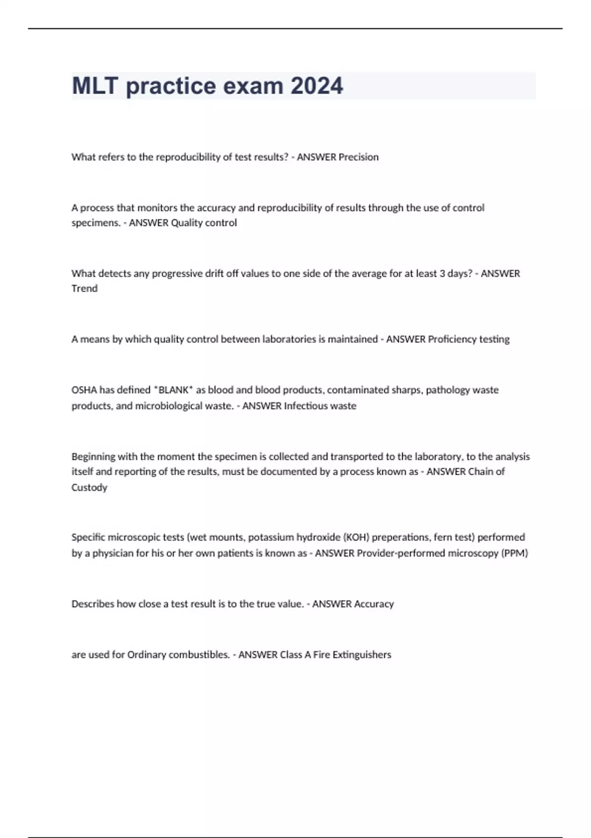 MLT practice exam Question and Answers 2024. What detects any progressive drift off values to one side of the average for at least 3 days? Trend A means by which quality control between laboratories is maintained Proficiency testing OSHA has defined BLANK as blood and blood products, contaminated sharps, pathology waste products, and microbiological waste. Infectious waste