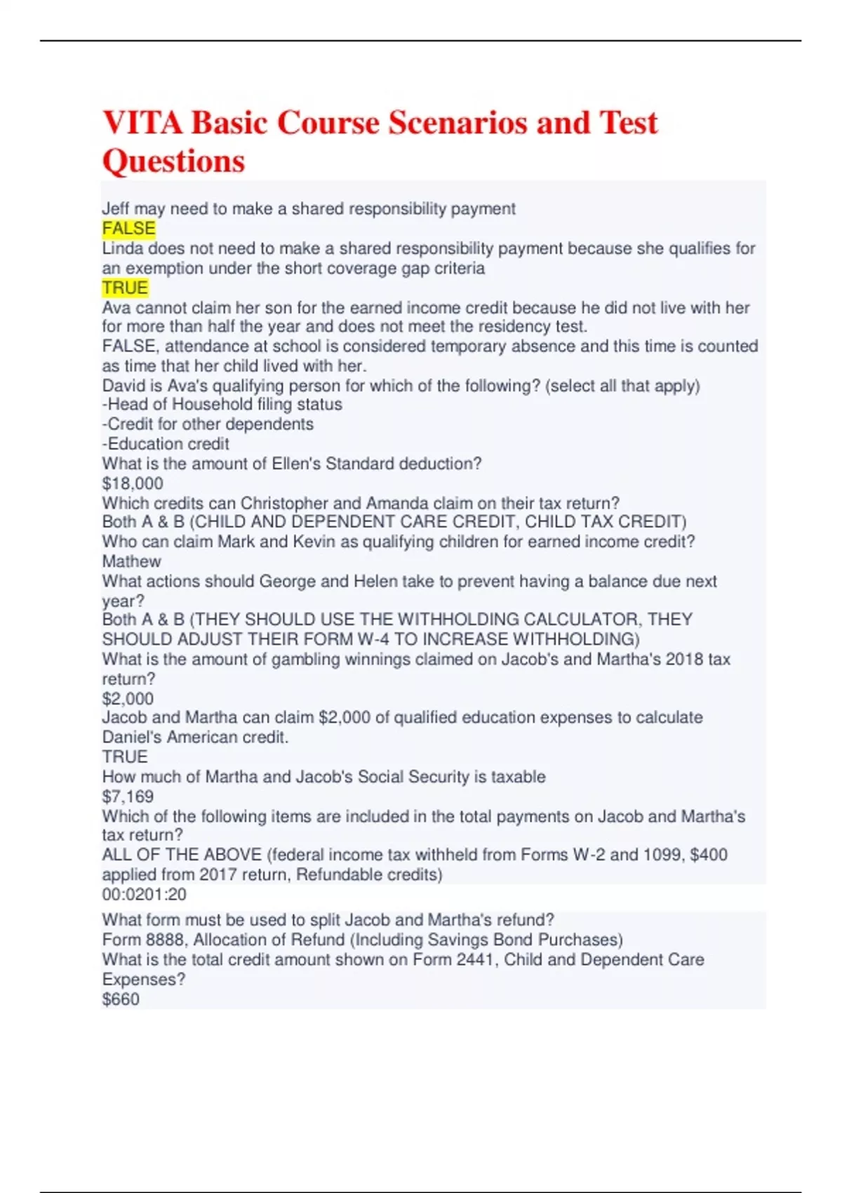 vita basic course scenarios and test questions