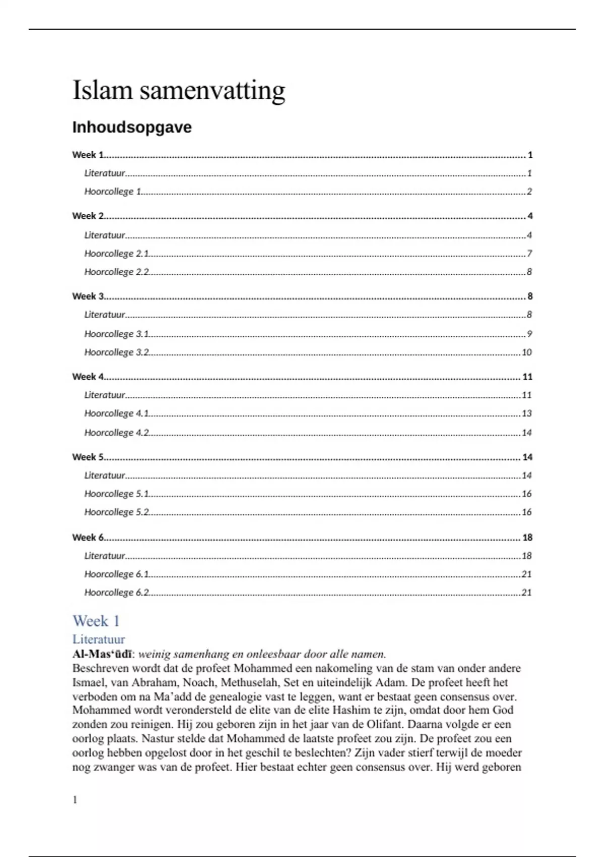 In dit document vind je samenvattingen van de literatuur en aantekeningen van de hoorcolleges voor het vak Islam.