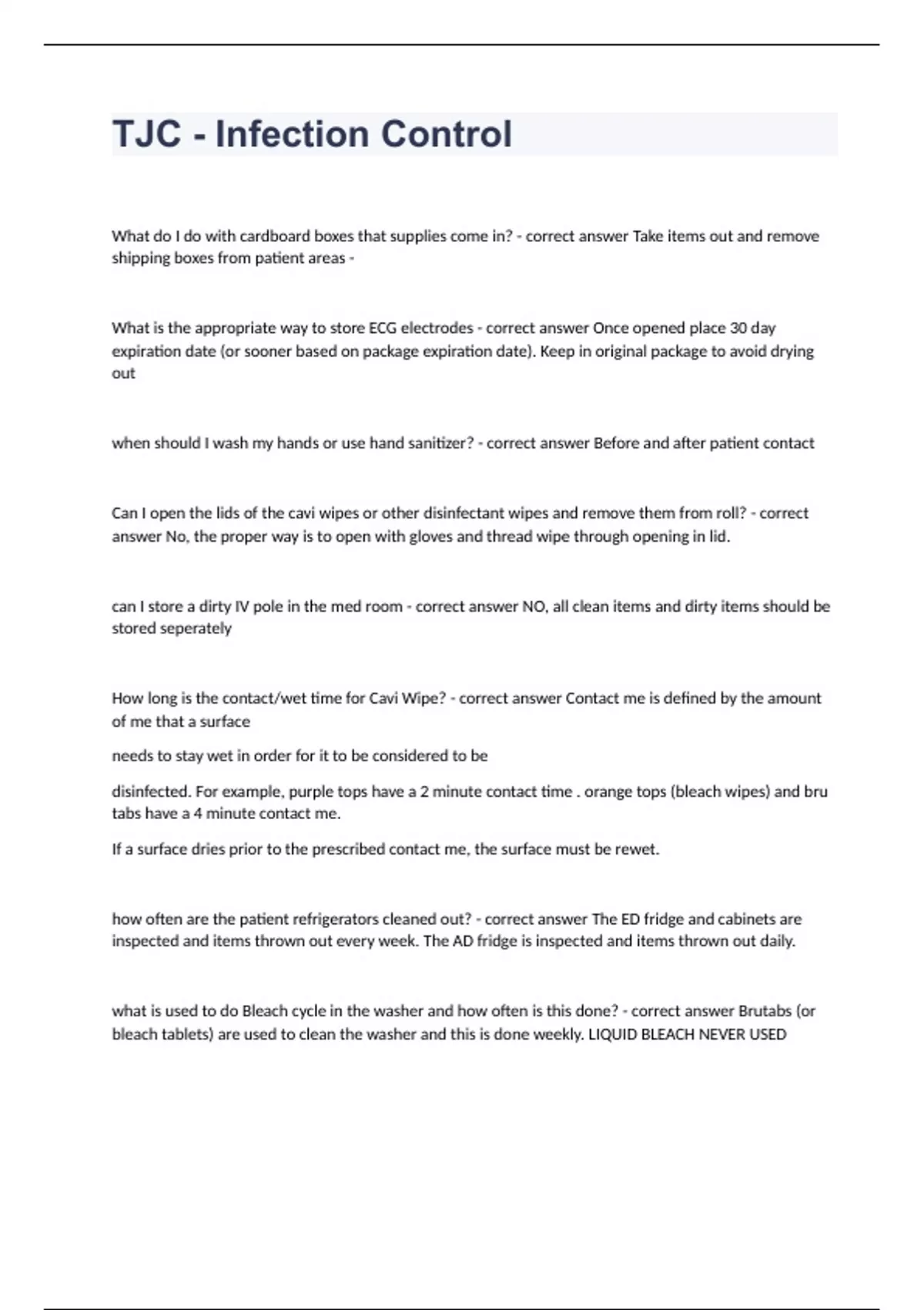 TJC - Infection Control Question and answers correctly solved 2023/2024 What do I do with cardboard boxes that supplies come in? - correct answer Take items out and remove shipping boxes from patient areas - What is the appropriate way to store ECG electrodes - correct answer Once opened place 30 day expiration date (or sooner based on package expiration date). Keep in original package to avoid drying out when should I wash my hands or use hand sanitizer? - correct answer Before and after patient contact Can I open the lids of the cavi wipes or other disinfectant wipes and remove them from roll? - correct answer No, the proper way is to open with gloves and thread wipe through opening in lid. can I store a dirty IV pole in the med room - correct answer NO, all clean items and dirty items should be stored seperately