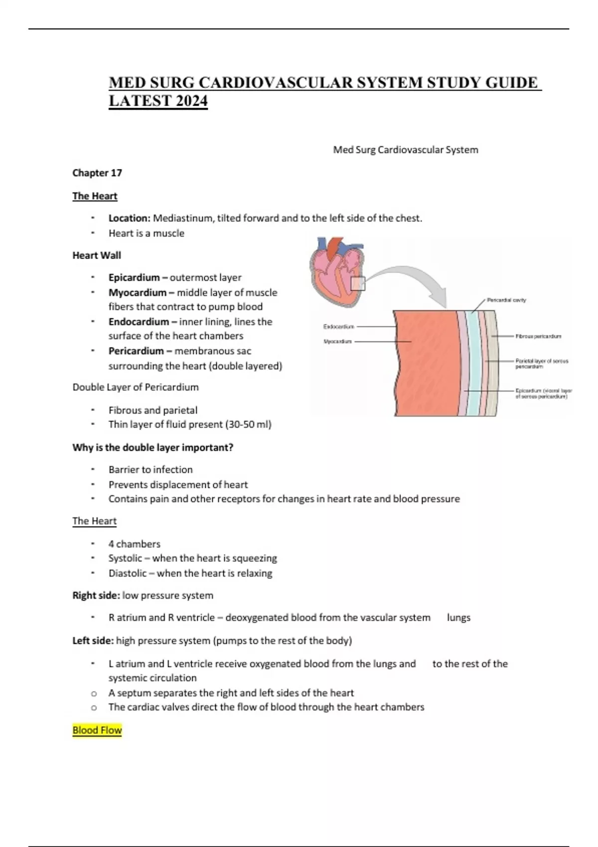 MED SURG CARDIOVASCULAR SYSTEM STUDY GUIDE LATEST 2024 Med Surg Cardiovascular System Chapter 17 The Heart •Location: Mediastinum, tilted forward and to the left side of the chest. •Heart is a muscle Heart Wall •Epicardium – outermost layer •Myocardium – middle layer of muscle fibers that contract to pump blood •Endocardium – inner lining, lines the surface of the heart chambers •Pericardium – membranous sac surrounding the heart (double layered) Double Layer of Pericardium •Fibrous and parietal •Thin layer of fluid present (30-50 ml) Why is the double layer important? •Barrier to infection •Prevents displacement of heart Contains pain and other receptors for changes in heart rate and blood pressure