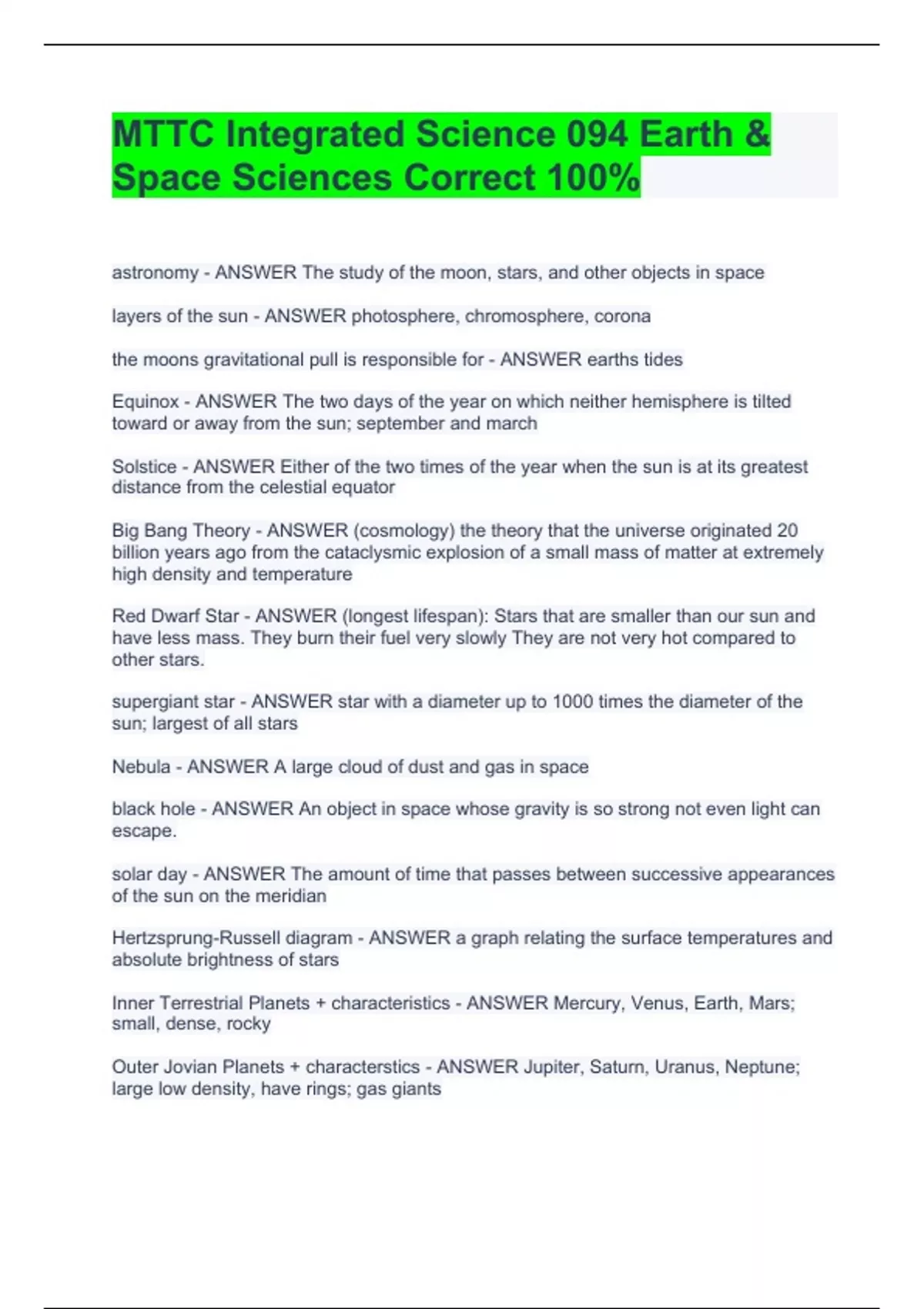 MTTC Integrated Science 094 Earth & Space Sciences Correct 100%