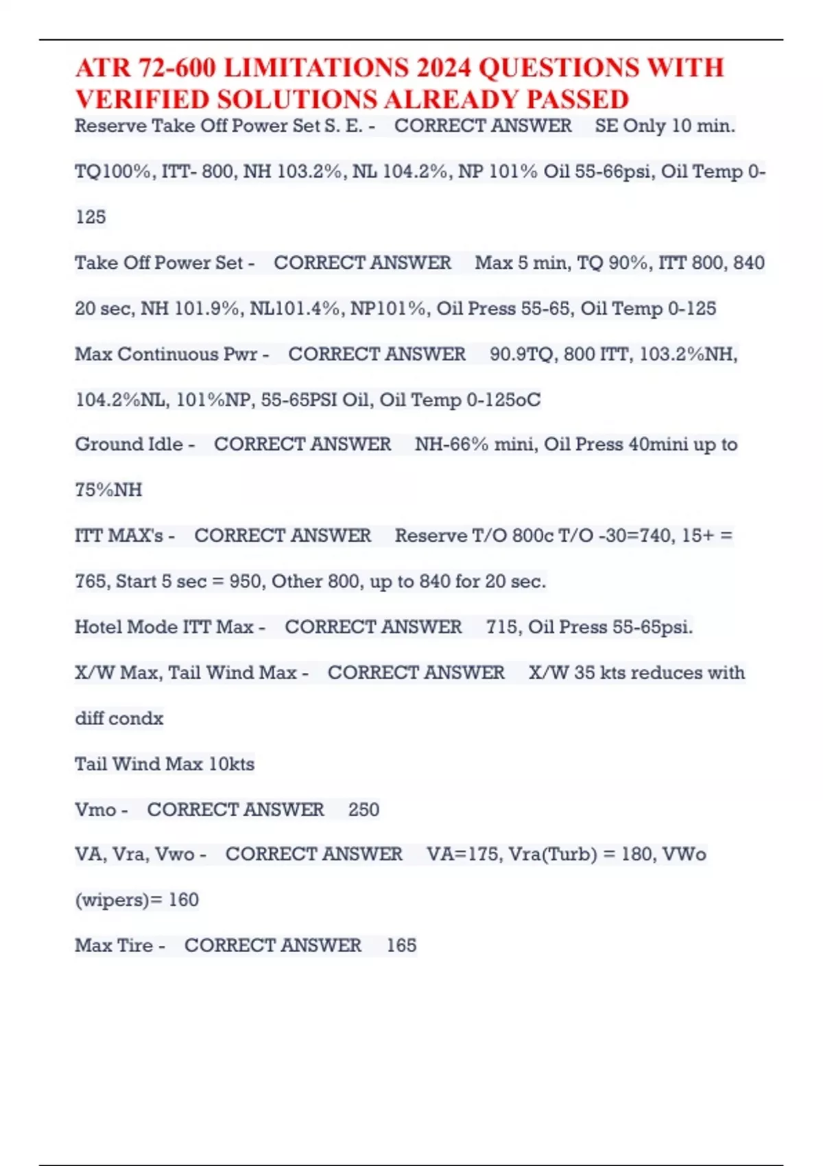 ATR 72-600 LIMITATIONS 2024 QUESTIONS WITH VERIFIED SOLUTIONS ALREADY PASSED Reserve Take Off Power Set S. E. - CORRECT ANSWER SE Only 10 min. TQ100%, ITT- 800, NH 103.2%, NL 104.2%, NP 101% Oil 55-66psi, Oil Temp 0- 125 Take Off Power Set - CORRECT ANSWER Max 5 min, TQ 90%, ITT 800, 840 20 sec, NH 101.9%, NL101.4%, NP101%, Oil Press 55-65, Oil Temp 0-125 Max Continuous Pwr - CORRECT ANSWER 90.9TQ, 800 ITT, 103.2%NH, 104.2%NL, 101%NP, 55-65PSI Oil, Oil Temp 0-125oC Ground Idle - CORRECT ANSWER NH-66% mini, Oil Press 40mini up to 75%NH ITT MAX's - CORRECT ANSWER Reserve T/O 800c T/O -30=740, 15+ = 765, Start 5 sec = 950, Other 800, up to 840 for 20 sec. Hotel Mode ITT Max - CORRECT ANSWER 715, Oil Press 55-65psi. X/W Max, Tail Wind Max - CORRECT ANSWER X/W 35 kts reduces with diff condx Tail Wind Max 10kts Vmo - CORRECT ANSWER 250 VA, Vra, Vwo - CORRECT ANSWER VA=175, Vra(Turb) = 180, VWo (wipers)= 160 Max Tire - CORRECT ANSWER 165 ATR 72-600 LIMITATIONS 2024 QUESTIONS WITH VERIFIED SOLUTIONS ALREADY PASSED Flap Speeds - CORRECT ANSWER VFE 15= 185 VFE 30=150 Gear Speeds - CORRECT ANSWER VLe (gear out) = 185 VLo Retract = 160 VLo Lower = 170 Fuel Weights & Max imbalance - CORRECT ANSWER Fuel 5000kg (2500 per tank) Max inbalance 730kg MTOW, MLW, MZFW - CORRECT ANSWER MTaxi = 23,170kg MTOW=23,000kg MLW=22,350kg MZFW=21,000kg BUGS Take Off - CORRECT ANSWER Green - V1 or 70kts Yellow - VR White - Final T/0 Red - Icing Bug Speed Bug - V2 Speed on AutoPilot V2+