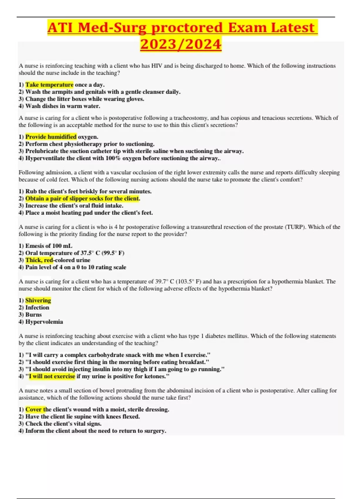 ATI Med-Surg proctored Exam Latest 2023/2024 A nurse is reinforcing teaching with a client who has HIV and is being discharged to home. Which of the following instructions should the nurse include in the teaching? 1) Take temperature once a day. 2) Wash the armpits and genitals with a gentle cleanser daily. 3) Change the litter boxes while wearing gloves. 4) Wash dishes in warm water. A nurse is caring for a client who is postoperative following a tracheostomy, and has copious and tenacious secretions. Which of the following is an acceptable method for the nurse to use to thin this client's secretions? 1) Provide humidified oxygen. 2) Perform chest physiotherapy prior to suctioning. 3) Prelubricate the suction catheter tip with sterile saline when suctioning the airway. 4) Hyperventilate the client with 100% oxygen before suctioning the airway.. Following admission, a client with a vascular occlusion of the right lower extremity calls the nurse and reports difficulty sleeping because of cold feet. Which of the following nursing actions should the nurse take to promote the client's comfort? 1) Rub the client's feet briskly for several minutes. 2) Obtain a pair of slipper socks for the client. 3) Increase the client's oral fluid intake. 4) Place a moist heating pad under the client's feet. A nurse is caring for a client is who is 4 hr postoperative following a transurethral resection of the prostate (TURP). Which of the following is the priority finding for the nurse report to the provider? 1) Emesis of 100 mL 2) Oral temperature of 37.5° C (99.5° F) 3) Thick, red-colored urine 4) Pain level of 4 on a 0 to 10 rating scale A nurse is caring for a client who has a temperature of 39.7° C (103.5° F) and has a prescription for a hypothermia blanket. The nurse should monitor the client for which of the following adverse effects of the hypothermia blanket? 1) Shivering 2) Infection 3) Burns 4) Hypervolemia A nurse is reinforcing teaching about exercise with a client who has type 1 diabetes mellitus. Which of the following statements by the client indicates an understanding of the teaching? 1) "I will carry a complex carbohydrate snack with me when I exercise." 2) "I should exercise first thing in the morning before eating breakfast." 3) "I should avoid injecting insulin into my thigh if I am going to go running." 4) "I will not exercise if my urine is positive for ketones." A nurse notes a small section of bowel protruding from the abdominal incision of a client who is postoperative. After calling for assistance, which of the following actions should the nurse take first? 1) Cover the client's wound with a moist, sterile dressing. 2) Have the client lie supine with knees flexed. 3) Check the client's vital signs. 4) Inform the client about the need to return to surgery. A nurse is collecting data from a client who has alcohol use disorder and is experiencing metabolic acidosis. Which of the following manifestations should the nurse expect? 1) Cool, clammy skin. 2) Hyperventilation 3) Increased blood pressure 4) Bradycardia A nurse is reinforcing discharge teaching with a client following a cataract extraction. Which of the following should the nurse include in the teaching? 1) Avoid bending at the waist. 2) Remove the eye shield at bedtime. 3) Limit the use of laxatives if constipated. 4) Seeing flashes of light is an expected finding following extraction. A nurse is caring for a client who has heart failure and has been taking digoxin 0.25 mg daily. The client refuses breakfast and reports nausea. Which of the following actions should the nurse take first? 1) Suggest that the client rests before eating the meal. 2) Request a dietary consult. 3) Check the client's vital signs. 4) Request an order for an antiemetic. A nurse is caring for a client who is 3 days postoperative following a cholecystectomy. The nurse suspects the client's wound is infected because the drainage from the dressing is yellow and thick. Which of the following findings should the nurse report as the type of drainage found? 1) Sanguineous 2) Serous 3) Serosanguineous 4) Purulent A nurse is reinforcing discharge teaching to a client following arthroscopic surgery. To prevent postoperative complications which of the following actions should be reinforced during the teaching? 1) Administer an opioid analgesic to the client 30 min prior to initiating CPM exercises. 2) Place the client’s affected leg into the CPM machine with the machine in the flexed position. 3) Place the client into a high Fowler’s position when initiating the CPM exercises. 4) Align the joints of the CPM machine with the knee gatch in the client’s bed. A nurse is collecting data from a client who has emphysema. Which of the following findings should the nurse expect? (Select all that apply.) 1) Dyspnea 2) Barrel chest 3) Clubbing of the fingers 4) Shallow respirations 5) Bradycardia A nurse is caring for a client who sustained a basal skull fracture. When performing morning hygiene care, the nurse notices a thin stream of clear drainage coming from out of the client's right nostril. Which of the following actions should the nurse take first? 1) Take the client's temperature. 2) Place a dressing under the client's nose. 3) Notify the charge nurse. 4) Test the drainage for glucose. A nurse is caring for a client who has a spinal cord injury at T-4. The nurse should recognize that the client is at risk for autonomic dysreflexia. Which of the following interventions should the nurse take to prevent autonomic dysreflexia? 1) Monitor for elevated blood pressure. 2) Provide analgesia for headaches. 3) Prevent bladder distention. 4) Elevate the client's head. A nurse is caring for a client who is being evaluated for endometrial cancer. Which of the following findings should the nurse expect the client to report? 1) Hot flashes 2) Recurrent urinary tract infections 3) Blood in the stool 4) Abnormal vaginal bleeding A nurse is caring for a client following an 