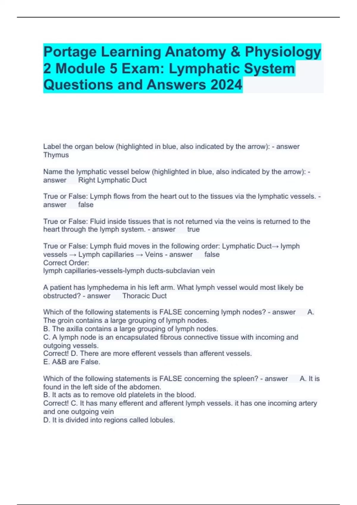 2 Module 5 Exam: Lymphatic System Questions and Answers 2024