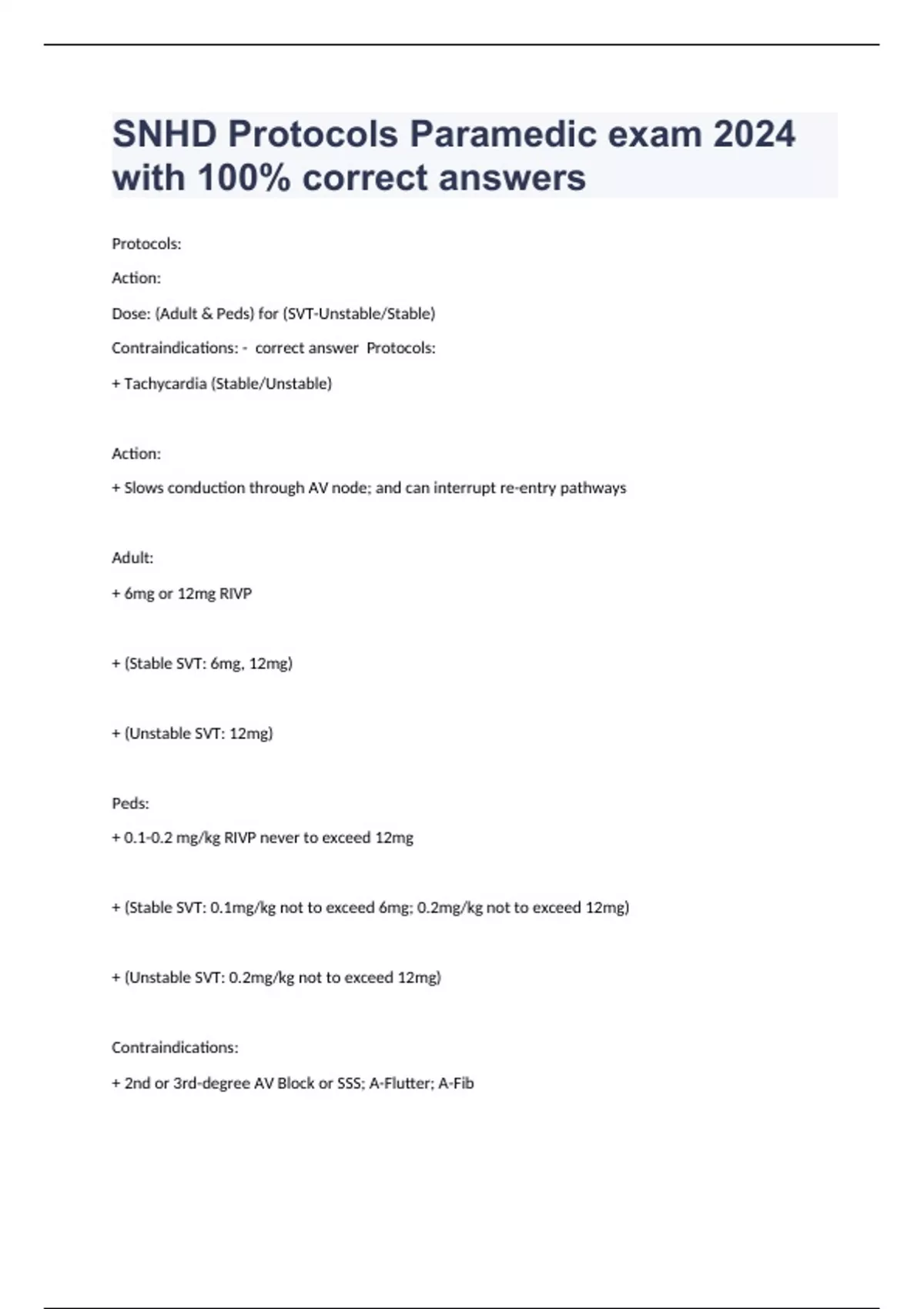 Protocols: Action: Dose: (Adult & Peds) for (SVT-Unstable/Stable) Contraindications: - correct answer Protocols: + Tachycardia (Stable/Unstable) Action: + Slows conduction through AV node; and can interrupt re-entry pathways Adult: + 6mg or 12mg RIVP + (Stable SVT: 6mg, 12mg) + (Unstable SVT: 12mg) Peds: + 0.1-0.2 mg/kg RIVP never to exceed 12mg + (Stable SVT: 0.1mg/kg not to exceed 6mg; 0.2mg/kg not to exceed 12mg) + (Unstable SVT: 0.2mg/kg not to exceed 12mg) Contraindications: + 2nd or 3rd-degree AV Block or SSS; A-Flutter; A-Fib