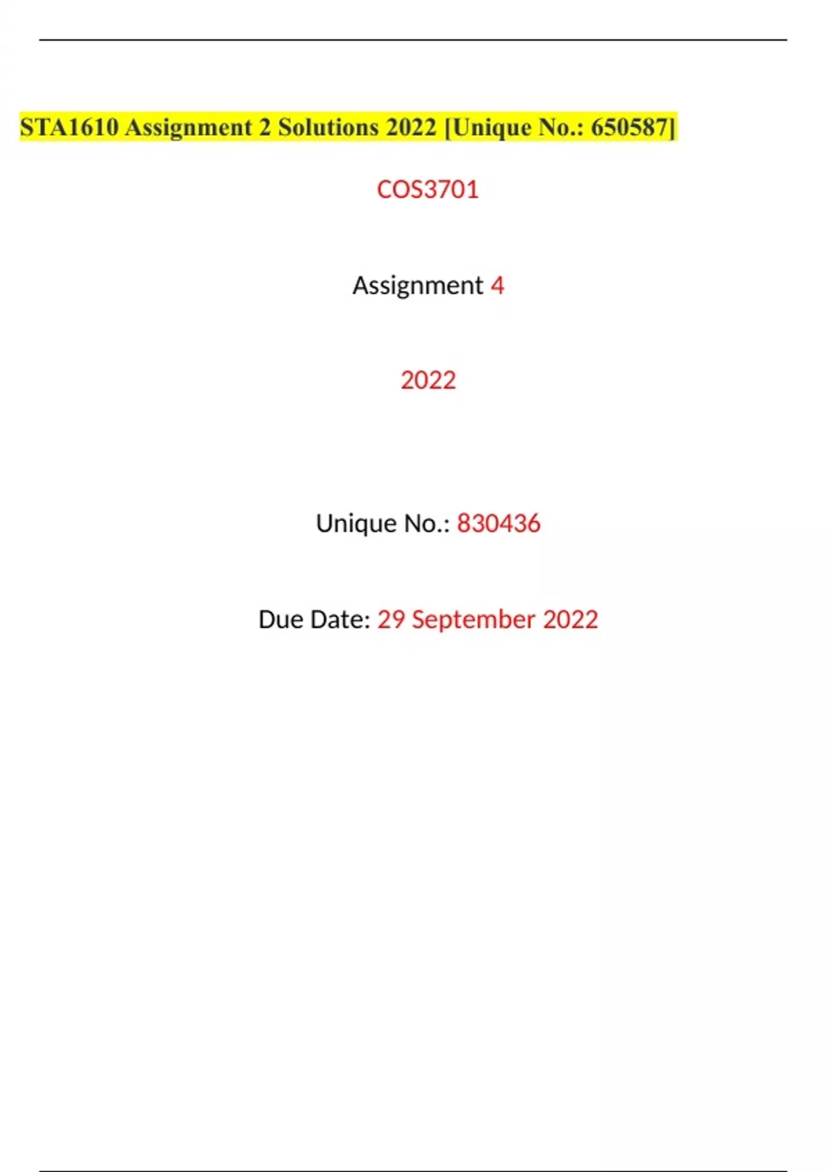 STA1610 Assignment 2 Solutions 2022 [Unique No.: 650587] COS3701 Assignment 4 2022