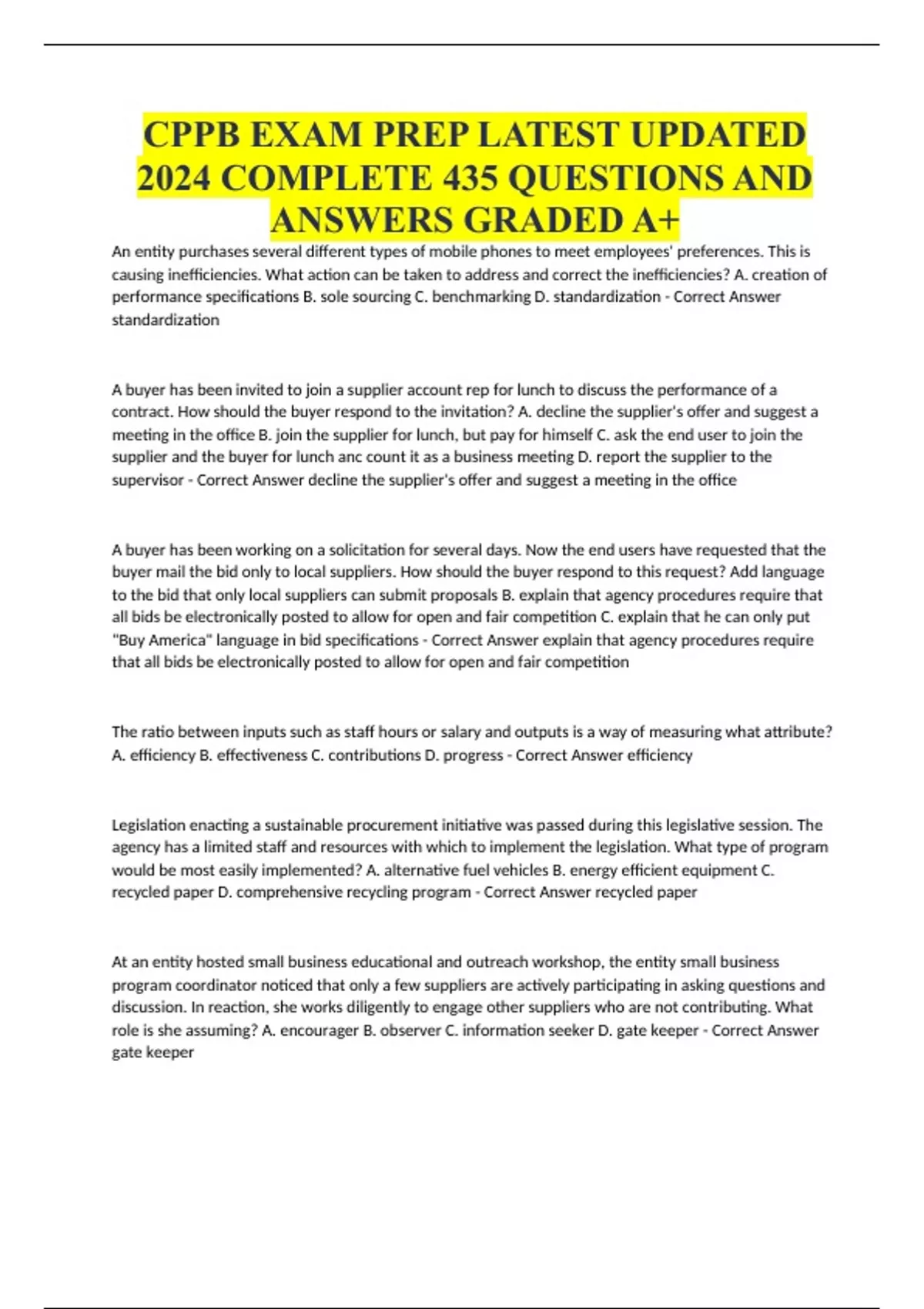 CPPB EXAM PREP LATEST UPDATED 2024 COMPLETE 435 QUESTIONS AND ANSWERS GRADED A+ An entity purchases several different types of mobile phones to meet employees' preferences. This is causing inefficiencies. What action can be taken to address and correct the inefficiencies? A. creation of performance specifications B. sole sourcing C. benchmarking D. standardization - Correct Answer standardization A buyer has been invited to join a supplier account rep for lunch to discuss the performance of a contract. How should the buyer respond to the invitation? A. decline the supplier's offer and suggest a meeting in the office B. join the supplier for lunch, but pay for himself C. ask the end user to join the supplier and the buyer for lunch anc count it as a business meeting D. report the supplier to the supervisor - Correct Answer decline the supplier's offer and suggest a meeting in the office A buyer has been working on a solicitation for several days. Now the end users have requested that the buyer mail the bid only to local suppliers. How should the buyer respond to this request? Add language to the bid that only local suppliers can submit proposals B. explain that agency procedures require that all bids be electronically posted to allow for open and fair competition C. explain that he can only put "Buy America" language in bid specifications - Correct Answer explain that agency procedures require that all bids be electronically posted to allow for open and fair competition The ratio between inputs such as staff hours or salary and outputs is a way of measuring what attribute? A. efficiency B. effectiveness C. contributions D. progress - Correct Answer efficiency Legislation enacting a sustainable procurement initiative was passed during this legislative session. The agency has a limited staff and resources with which to implement the legislation. What type of program would be most easily implemented? A. alternative fuel vehicles B. energy efficient equipment C. recycled paper D. comprehensive recycling program - Correct Answer recycled paper At an entity hosted small business educational and outreach workshop, the entity small business program coordinator noticed that only a few suppliers are actively participating in asking questions and discussion. In reaction, she works diligently to engage other suppliers who are not contributing. What role is she assuming? A. encourager B. observer C. information seeker D. gate keeper - Correct Answer gate keeper The city's IT dept has a need to purchase 20 copies of a how-t