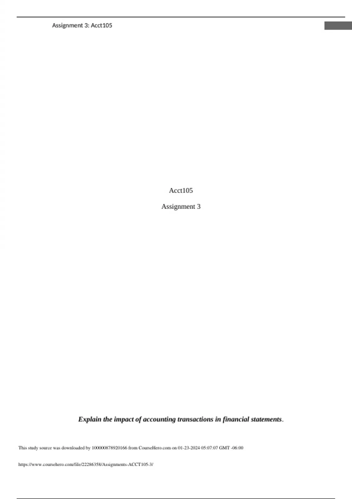 Assignment 3: Acct105 2 There is so many things that can impact financial statements when it comes to certain accounting transactions. Expenses and income in the financial statements help any type of company identify what their net worth and their net income is. When we are looking the net worth or income, you are usually looking within a certain time frame. When you record revenues, it shows that companies growing business transactions are done before expenses. When you are recording expenses, this will help enable the company to ascertain any types of repeat expenses that will occur monthly, bimonthly, etc and therefore this will help project on these certain expenses and it will do a financial analysis on where the company growth is going. These types of expenses will make sure that the company will be able to see if there are any unnecessary costs. All the transactions that are recorded together will show a company’s balance sheet. This is so that it can be used to show a financial position. Financial position of the organization will help assist the company in valuation. Net worth is identified by what the financial position shows. Transactions in the accounts can also be used to identify the company’s assets that are owned by the company to increase their net worth. The assets are also can be many different things. It can be land, buildings, and the equipment that the business owns. These assets can be liquidated if the need to increase cash flow for the business. You will need to make sure that this process of the liquidation on the needed accounting transaction sheets. This needs to be documented in the correct ways