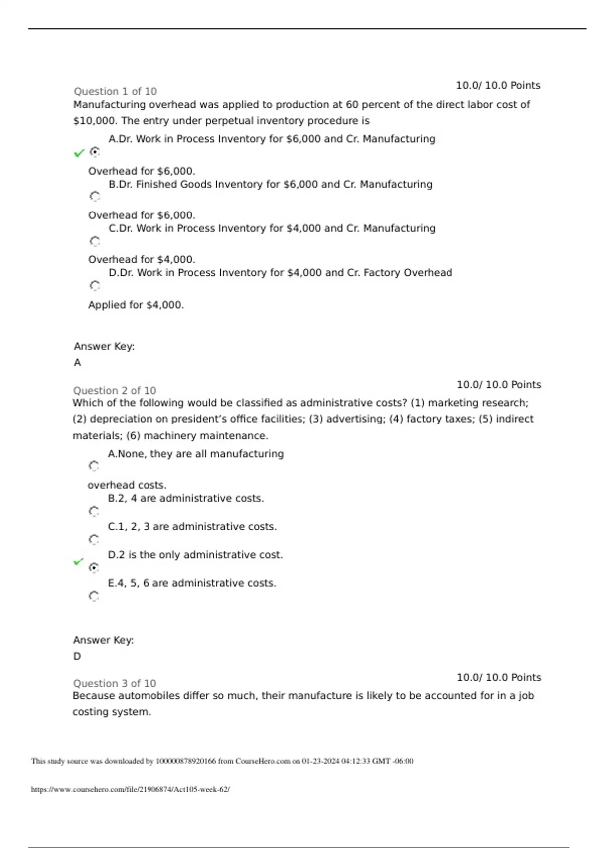 Question 1 of 10 10.0/ 10.0 Points Manufacturing overhead was applied to production at 60 percent of the direct labor cost of $10,000. The entry under perpetual inventory procedure is A.Dr. Work in Process Inventory for $6,000 and Cr. Manufacturing Overhead for $6,000. B.Dr. Finished Goods Inventory for $6,000 and Cr. Manufacturing Overhead for $6,000. C.Dr. Work in Process Inventory for $4,000 and Cr. Manufacturing Overhead for $4,000. D.Dr. Work in Process Inventory for $4,000 and Cr. Factory Overhead Applied for $4,000. Answer Key: A Question 2 of 10 10.0/ 10.0 Points Which of the following would be classified as administrative costs? (1) marketing research; (2) depreciation on president’s office facilities; (3) advertising; (4) factory taxes; (5) indirect materials; (6) machinery maintenance. A.None, they are all manufacturing overhead costs. B.2, 4 are administrative costs. C.1, 2, 3 are administrative costs. D.2 is the only administrative cost. E.4, 5, 6 are administrative costs.