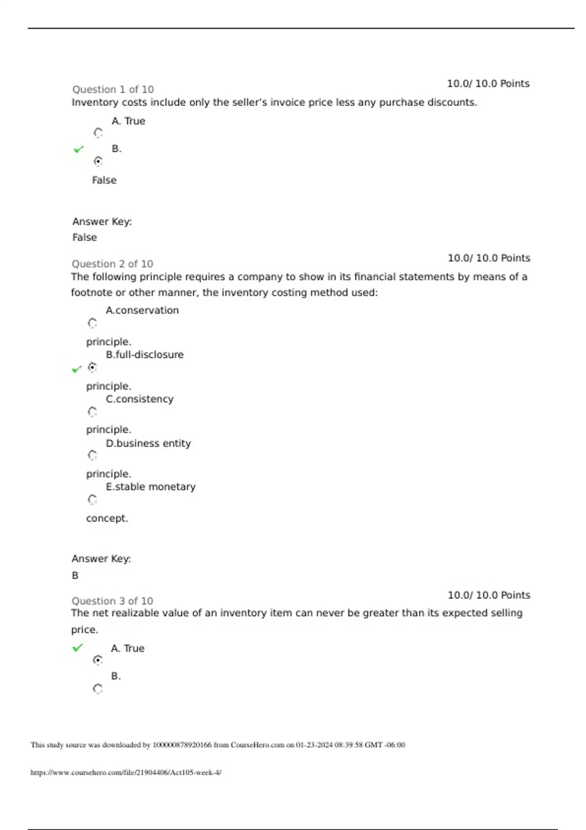 Question 1 of 10 10.0/ 10.0 Points Inventory costs include only the seller’s invoice price less any purchase discounts. A. True B. False Answer Key: False Question 2 of 10 10.0/ 10.0 Points The following principle requires a company to show in its financial statements by means of a footnote or other manner, the inventory costing method used: A .conservation principle. B .full-disclosure principle. C .consistency principle. D. business entity principle. E .stable monetary concept