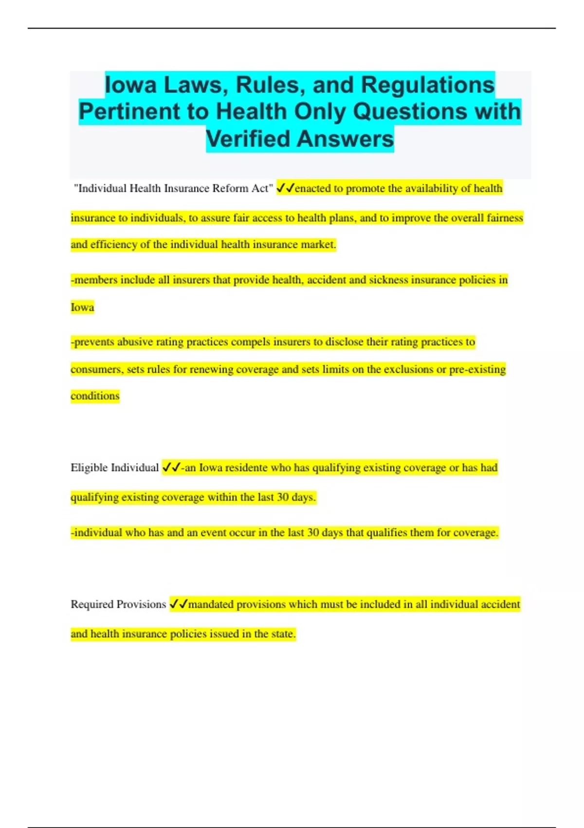 Iowa Laws, Rules, and Regulations Pertinent to Health Only Questions with Verified Answers