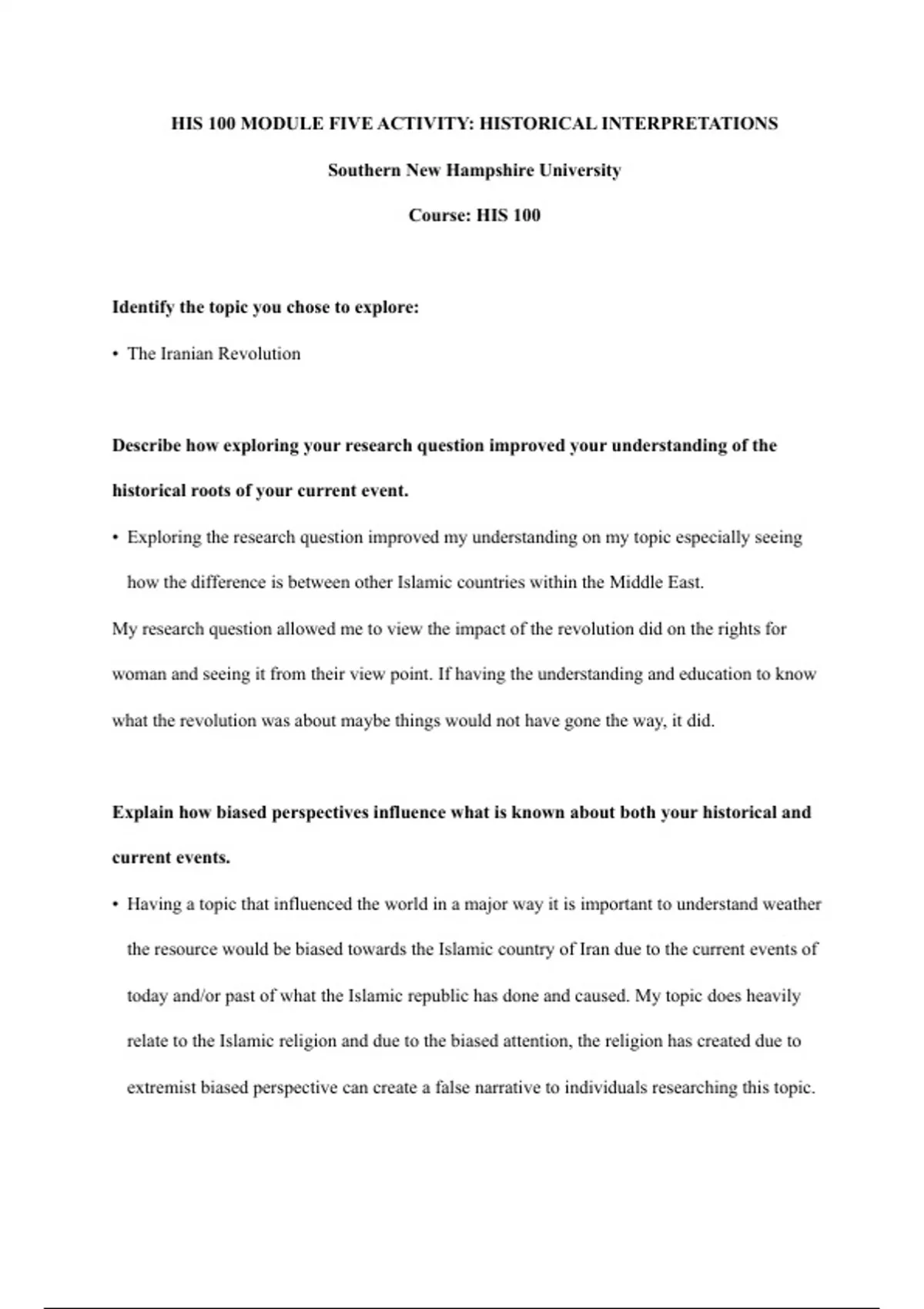 HIS 100 MODULE FIVE ACTIVITY: HISTORICAL INTERPRETATIONS Southern New Hampshire University Course: HIS 100 Identify the topic you chose to explore: Describe how exploring your research question improved your understanding of the historical roots of your current event. Explain how biased perspectives influence what is known about both your historical and current events. Propose how the narrative about your historical event might change if it were told from a missing perspective.