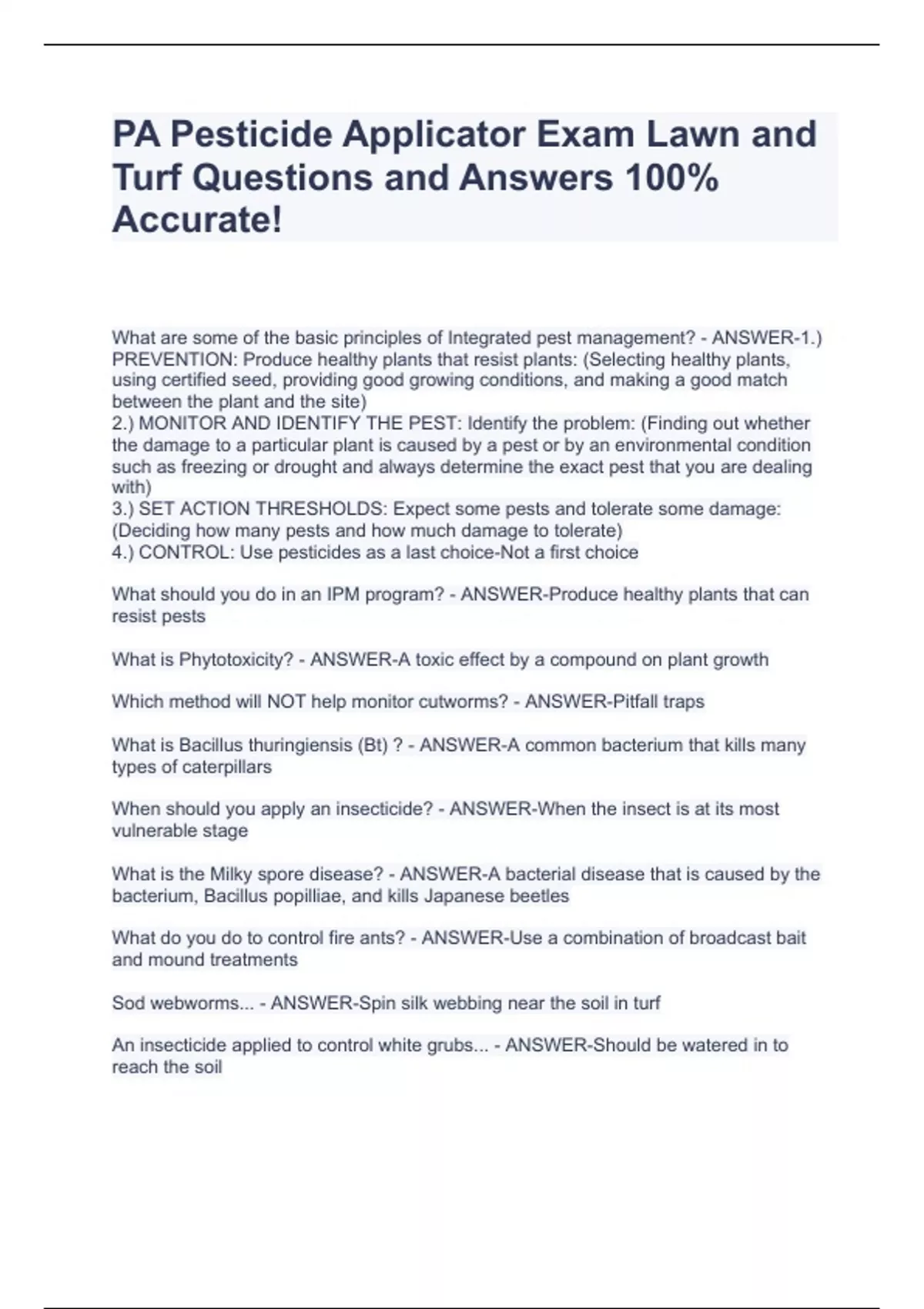 What are some of the basic principles of Integrated pest management? - ANSWER-1.) PREVENTION: Produce healthy plants that resist plants: (Selecting healthy plants, using certified seed, providing good growing conditions, and making a good match between the plant and the site) 2.) MONITOR AND IDENTIFY THE PEST: Identify the problem: (Finding out whether the damage to a particular plant is caused by a pest or by an environmental condition such as freezing or drought and always determine the exact pest that you are dealing with) 3.) SET ACTION THRESHOLDS: Expect some pests and tolerate some damage: (Deciding how many pests and how much damage to tolerate) 4.) CONTROL: Use pesticides as a last choice-Not a first choice What should you do in an IPM program? - ANSWER-Produce healthy plants that can resist pests What is Phytotoxicity? - ANSWER-A toxic effect by a compound on plant growth Which method will NOT help monitor cutworms? - ANSWER-Pitfall traps What is Bacillus thuringiensis (Bt) ? - ANSWER-A common bacterium that kills many types of caterpillars When should you apply an insecticide? - ANSWER-When the insect is at its most vulnerable stage What is the Milky spore disease? - ANSWER-A bacterial disease that is caused by the bacterium, Bacillus popilliae, and kills Japanese beetles What do you do to control fire ants? - ANSWER-Use a combination of broadcast bait and mound treatments Sod webworms... - ANSWER-Spin silk webbing near the soil in turf An insecticide applied to control white grubs... - ANSWER-Should be watered in to reach the soil Mole crickets... - ANSWER-Have only one generation per year What are the 2 different kinds of metamorphosis that insect pests undergo? - ANSWER-1.) Gradual metamorphosis: Nymphs (young stages) of insects that undergo this look like small versions of the adult 2.) Complete metamorphosis (most common type of development among turf grass pests): The young stages of insects that undergo this look very different from the adults before before they become pupae and change into adults H
