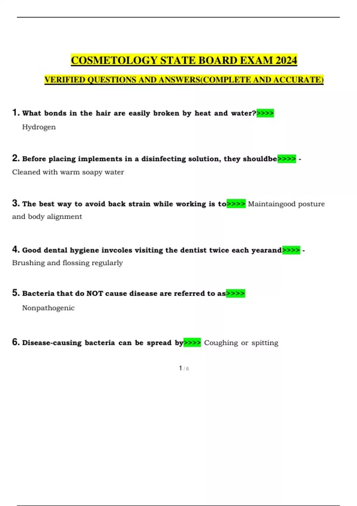 COSMETOLOGY STATE BOARD EXAM 2024 VERIFIED QUESTIONS AND ANSWERS(COMPLETE AND ACCURATE) 1. What bonds in the hair are easily broken by heat and water? Hydrogen 2. Before placing implements in a disinfecting solution, they should be - Cleaned with warm soapy water 3. The best way to avoid back strain while working is to Maintain good posture and body alignment 4. Good dental hygiene invcoles visiting the dentist twice each year and - Brushing and flossing regularly 5. Bacteria that do NOT cause disease are referred to as Nonpathogenic 6. Disease-causing bacteria can be spread by Coughing or spitting 7. The method of cleaning instruments that kill all micro organisms, including bacterial spores, is Sterilization 8. Antiseptics differ from disinfectants because they Are safe to use on skin 9. A quaternary ammonium compound is used as A disinfectant 10. When using disinfectants, you should remember that they Can be dan- gerous if used incorrectly. 11. Trichology is the study of Hair 12. Name the two distinct phases of the life cycle of bacteria Vegetative and spore forming 13. Seen in cross section, straight hair would appear to be Round 14. Your clients has a bad case of dry dandruff. You should suggest Scalp treatments and frequent mild shampoos 15. Alopecia areata occurs when the clients hair Suddenly falls out in round patches 16. The visible portion of the nail itself is referred to as the Nail plate 17. A hangnail can be caused by Cutting the cuticle improperly 18. One way to reassure clients about the cleanliness and sanitation of yur implements is to Place implements into a jar with disinfectanting solution in it. 19. The outermost and thinnest layer of the skin is tbe Epidermis 20. The study of the skin and its diseases and treatment is referred to as Dermatology 21. A steatoma, or sebaceous cyst, is A subcutaneous tumor of a sebaceous gland 22. Which agency regulates how cosmetologist store, use, mix, and dispose of chemicals properly? OSHA 23. Which is an example of a local infection? Measles 24. Which of the following lives only by penetrating cells in becoming part of them? Viruses 25. The main function of the blood is to Carry food and oxygen an