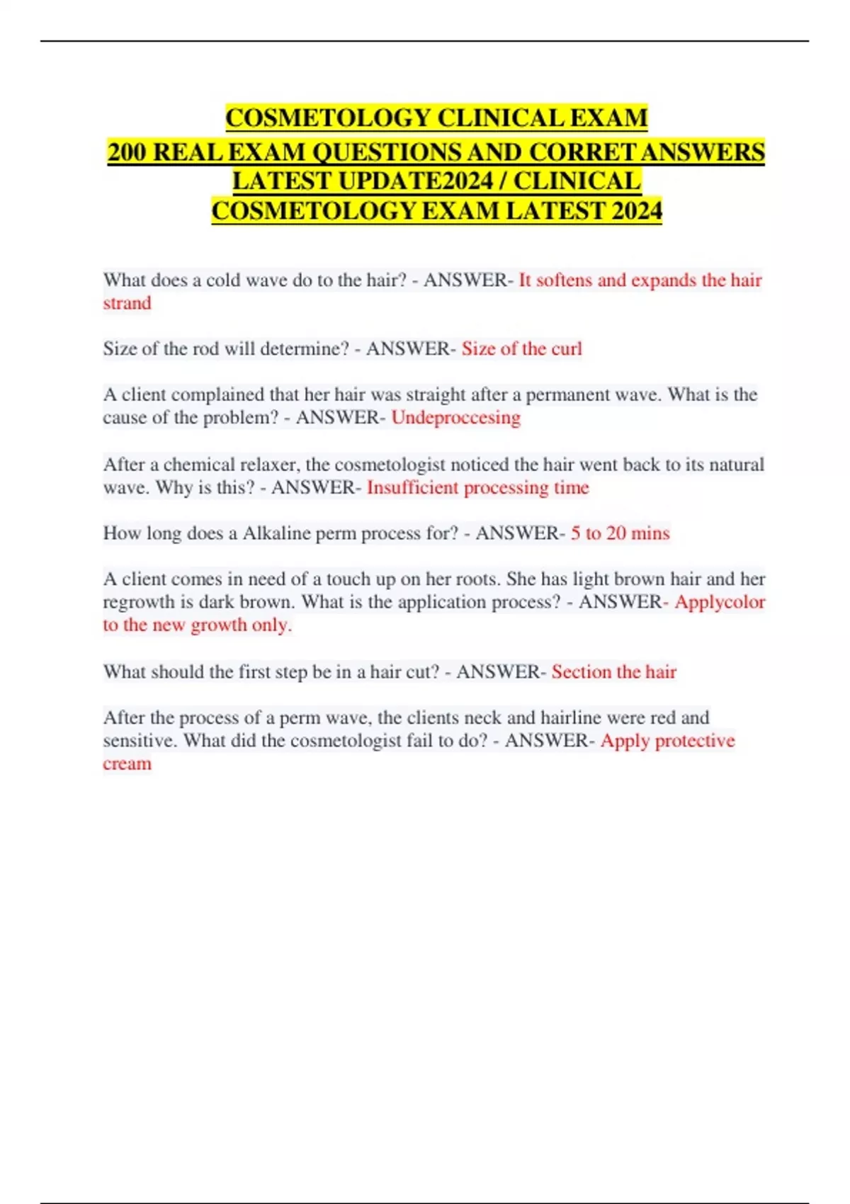 COSMETOLOGY CLINICAL EXAM 200 REAL EXAM QUESTIONS AND CORRET ANSWERS LATEST UPDATE 2024 / CLINICAL COSMETOLOGY EXAM LATEST 2024 What does a cold wave do to the hair? - ANSWER- It softens and expands the hair strand Size of the rod will determine? - ANSWER- Size of the curl A client complained that her hair was straight after a permanent wave. What is the cause of the problem? - ANSWER- Undeproccesing After a chemical relaxer, the cosmetologist noticed the hair went back to its natural wave. Why is this? - ANSWER- Insufficient processing time How long does a Alkaline perm process for? - ANSWER- 5 to 20 mins A client comes in need of a touch up on her roots. She has light brown hair and her regrowth is dark brown. What is the application process? - ANSWER- Applycolor to the new growth only. What should the first step be in a hair cut? - ANSWER- Section the hair After the process of a perm wave, the clients neck and hairline were red and sensitive. What did the cosmetologist fail to do? - ANSWER- Apply protective cream If the cosmetologist burns the clients ear with a thermal iron, what should be done? - ANSWER- Apply aloe Vera/ 1% gentian violet jelly While the client is processing with a perm wave, her eyes start to irritate, what should you do? - ANSWER- Flush with cold water If the client has a mild cut, what should you do? - ANSWER- Apply pressure with a clean cloth In a roller set, full volume curl is achieved by? - ANSWER- 45 degree angle and place on base For low elevation or 0 degree cut, you would part the hair into - ANSWER- 4 sections It is best to use the finger weave lotion when? - ANSWER- Hair is damp What does a neutralizer contain? - ANSWER- Hydrogen peroxide If the cosmetologist runs out of warm medium brown hair color, what can she mix to make the color? - ANSWER- 1/2 dark brown and 1/2 light brown A client wants to get a soft curl perm (reformation curl) but she already chemically relaxed her hair, what is done? - ANSWER- The client can not get the perm The roots will process lighter due to? - ANSWER- Body heat If a clients hair is overly curly, what is the mildest hair relaxer the cosmetologist can use? - ANSWER- Ammonium thioglycolate The mixture of all the primary colors in equal parts gives you - ANSWER- Black The mixture of unequal parts of the primary colors gives you - ANSWER- Brown How long does a semi-perm color last? - ANSWER- 4 to 6 shampoos A good mild alkaline shampoo has a ph of? - ANSWER- 8.0-9.0 What kind of haircut creates the most bulk? - ANSWER- 0 degree A pin curl consists of what three parts? - ANSWER- Base, stem, circle What is the ph for a thio relaxer? - ANSWER- 8 to 10 Prior to a manicure, implements should be? - ANSWER- Covered in a disinfecting tray To achieve the best finger wave results, you should? - ANSWER- Follow the natural growth pattern What corrective makeup is applied to close set eyes? - ANSWER- Extend eye shadow to the outer corners Before choosing your clients colors, what should be the main concern? - ANSWER- Texture and porosity When doing a chemical hair relaxer retouch, what should you apply to the ends to protect them? - ANSWER- Cream conditioner or porosity control conditioner If client faints, what should you do? - ANSWER- Lie them back down on the floor( prone position ) What does a strand test determine? - ANSWER- Processing time of perm wave or lightening process An acid perm requires a? - ANSWER- Plastic cap and preheated dryer Chemical relaxers breaks the? - ANSWER- Disulfide bonds To stop bleeding, use? - ANSWER- Powder alum