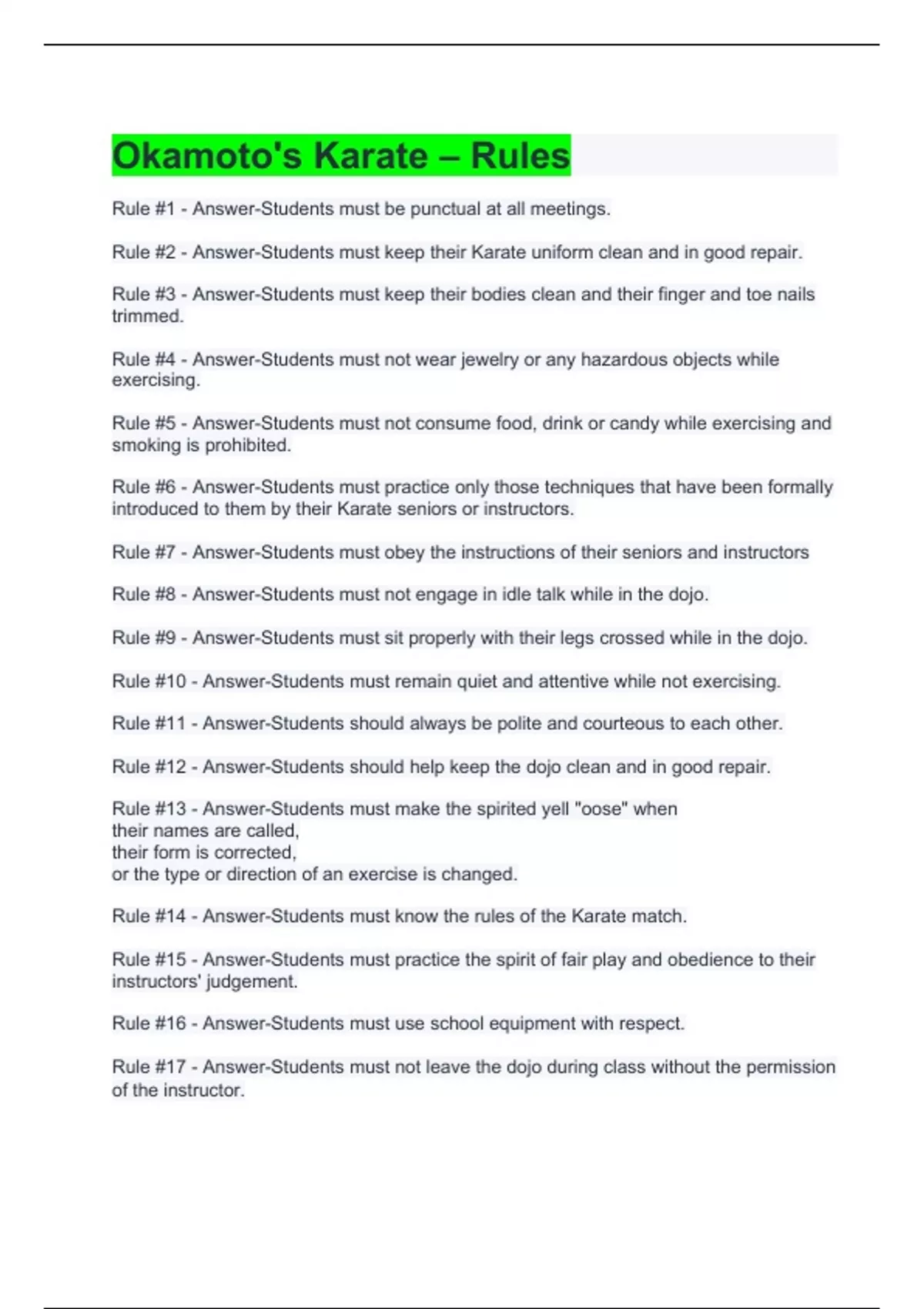 Okamoto's Karate – Rules