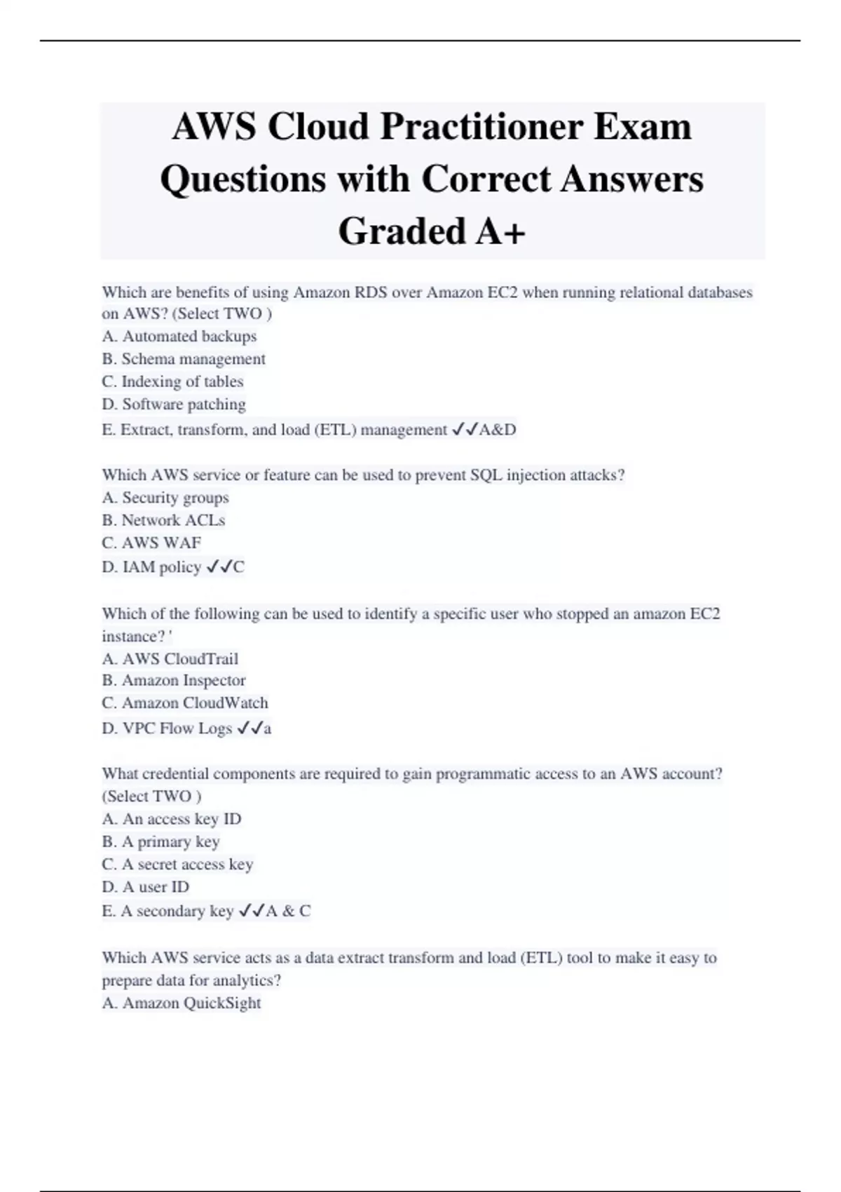 AWS Cloud Practitioner Exam Questions with Correct Answers Graded A+ Which are benefits of using Amazon RDS over Amazon EC2 when running relational databases on AWS? (Select TWO ) A. Automated backups B. Schema management C. Indexing of tables D. Software patching E. Extract, transform, and load (ETL) management A&D Which AWS service or feature can be used to prevent SQL injection attacks? A. Security groups B. Network ACLs C. AWS WAF D. IAM policy C Which of the following can be used to identify a specific user who stopped an amazon EC2 instance? ' A. AWS CloudTrail B. Amazon Inspector C. Amazon CloudWatch D. VPC Flow Logs a What credential components are required to gain programmatic access to an AWS account? (Select TWO ) A. An access key ID B. A primary key C. A secret access key D. A user ID E. A secondary key A & C Which AWS service acts as a data extract transform and load (ETL) tool to make it easy to prepare data for analytics? A. Amazon QuickSight