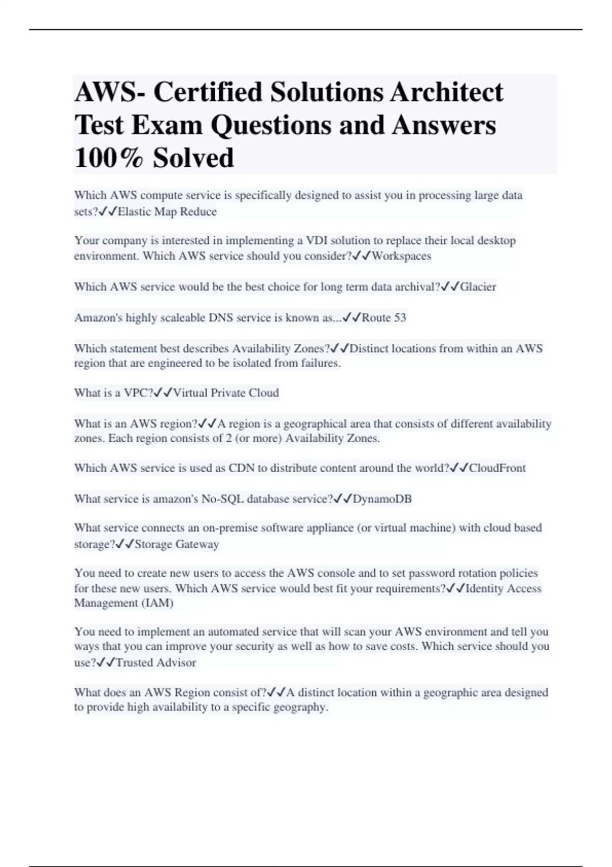 AWS- Certified Solutions Architect Test Exam Questions and Answers 100% Solved Which AWS compute service is specifically designed to assist you in processing large data sets?Elastic Map Reduce Your company is interested in implementing a VDI solution to replace their local desktop environment. Which AWS service should you consider?Workspaces Which AWS service would be the best choice for long term data archival?Glacier Amazon's highly scaleable DNS service is known as...Route 53 Which statement best describes Availability Zones?Distinct locations from within an AWS region that are engineered to be isolated from failures. What is a VPC?Virtual Private Cloud What is an AWS region?A region is a geographical area that consists of different availability zones. Each region consists of 2 (or more) Availability Zones. Which AWS service is used as CDN to distribute content around the world?CloudFront What service is amazon's No-SQL database service?DynamoDB What service connects an on-premise software appliance (or virtual machine) with cloud based storage?Storage Gateway You need to create new users to access the AWS console and to set password rotation policies for these new users. Which AWS service would best fit your requirements?Identity Access Management (IAM) You need to implement an automated service that will scan your AWS environment and tell you ways that you can improve your security as well as how to save costs. Which service should you use?Trusted Advisor What does an AWS Region consist of?A distinct location within a geographic area designed to provide high availability to a specific geography.