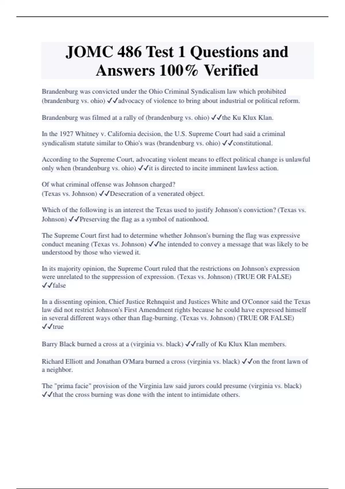 JOMC 486 Test 1 Questions and Answers 100% Verified Brandenburg was convicted under the Ohio Criminal Syndicalism law which prohibited (brandenburg vs. ohio) advocacy of violence to bring about industrial or political reform. Brandenburg was filmed at a rally of (brandenburg vs. ohio) the Ku Klux Klan. In the 1927 Whitney v. California decision, the U.S. Supreme Court had said a criminal syndicalism statute similar to Ohio's was (brandenburg vs. ohio) constitutional. According to the Supreme Court, advocating violent means to effect political change is unlawful only when (brandenburg vs. ohio) it is directed to incite imminent lawless action. Of what criminal offense was Johnson charged? (Texas vs. Johnson) Desecration of a venerated object. Which of the following is an interest the Texas used to justify Johnson's conviction? (Texas vs. Johnson) Preserving the flag as a symbol of nationhood. The Supreme Court first had to determine whether Johnson's burning the flag was expressive conduct meaning (Texas vs. Johnson) he intended to convey a message that was likely to be understood by those who viewed it. In its majority opinion, the Supreme Court ruled that the restrictions on Johnson's expression were unrelated to the suppression of expression. (Texas vs. Johnson) (TRUE OR FALSE) false In a dissenting opinion, Chief Justice Rehnquist and Justices White and O'Connor said the Texas law did not restrict Johnson's First Amendment rights because he could have expressed himself in several different ways other than flag-burning. (Texas vs. Johnson) (TRUE OR FALSE) true Barry Black burned a cross at a (virginia vs. black) rally of Ku Klux Klan members. Richard Elliott and Jonathan O'Mara burned a cross (virginia vs. black) on the front lawn of a neighbor. The "prima facie" provision of the Virginia law said jurors could presume (virginia vs. black) that the cross burning was done with the intent to intimidate others