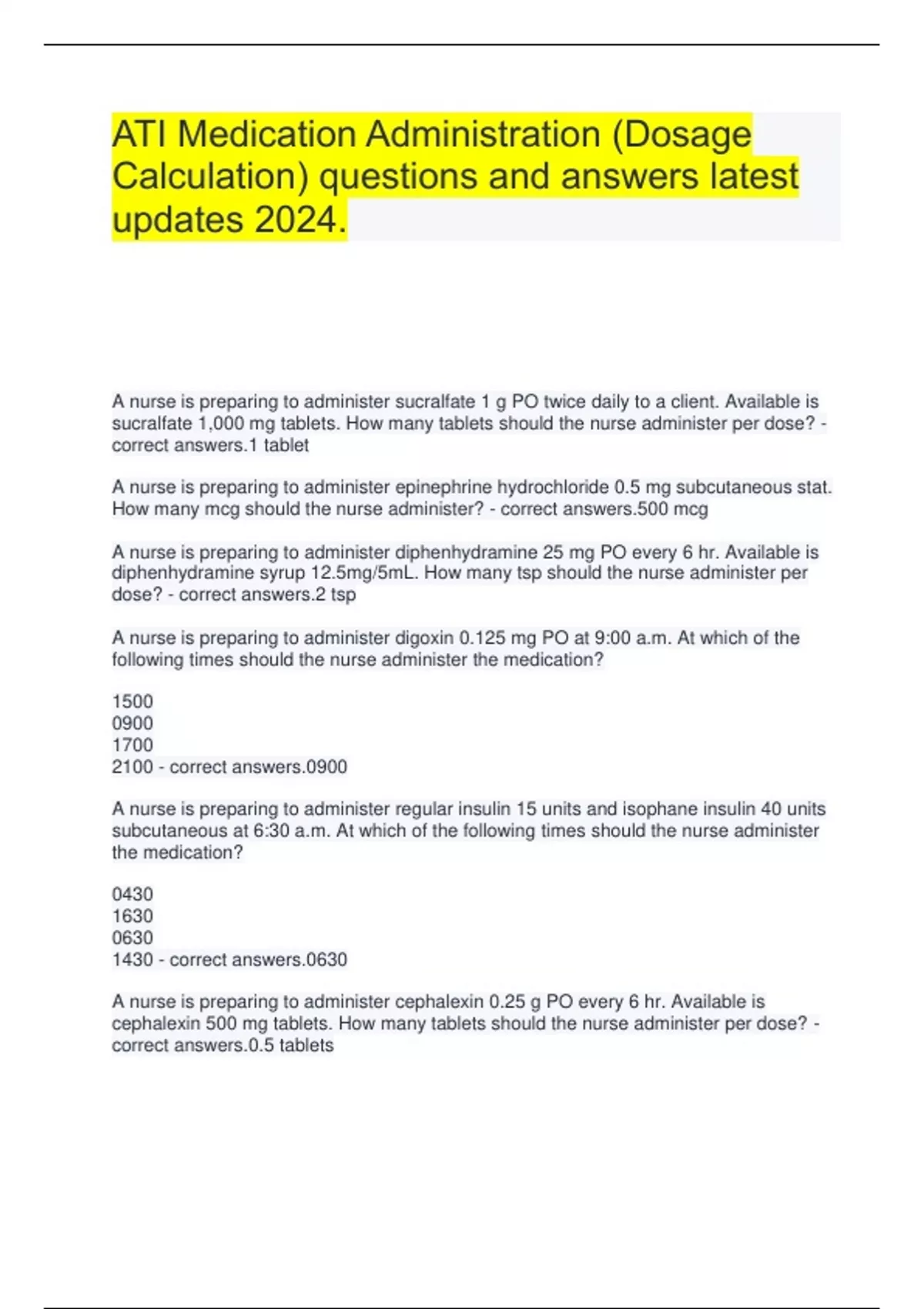 ATI Medication Administration (Dosage Calculation) questions and answers latest updates 2024. A nurse is preparing to administer sucralfate 1 g PO twice daily to a client. Available is sucralfate 1,000 mg tablets. How many tablets should the nurse administer per dose? - correct answers.1 tablet A nurse is preparing to administer epinephrine hydrochloride 0.5 mg subcutaneous stat. How many mcg should the nurse administer? - correct answers.500 mcg A nurse is preparing to administer diphenhydramine 25 mg PO every 6 hr. Available is diphenhydramine syrup 12.5mg/5mL. How many tsp should the nurse administer per dose? - correct answers.2 tsp A nurse is preparing to administer digoxin 0.125 mg PO at 9:00 a.m. At which of the following times should the nurse administer the medication? 1500 0900 1700 2100 - correct answers.0900 A nurse is preparing to administer regular insulin 15 units and isophane insulin 40 units subcutaneous at 6:30 a.m. At which of the following times should the nurse administer the medication? 0430 1630 0630 1430 - correct answers.0630 A nurse is preparing to administer cephalexin 0.25 g PO every 6 hr. Available is cephalexin 500 mg tablets. How many tablets should the nurse administer per dose? - correct answers.0.5 tablets