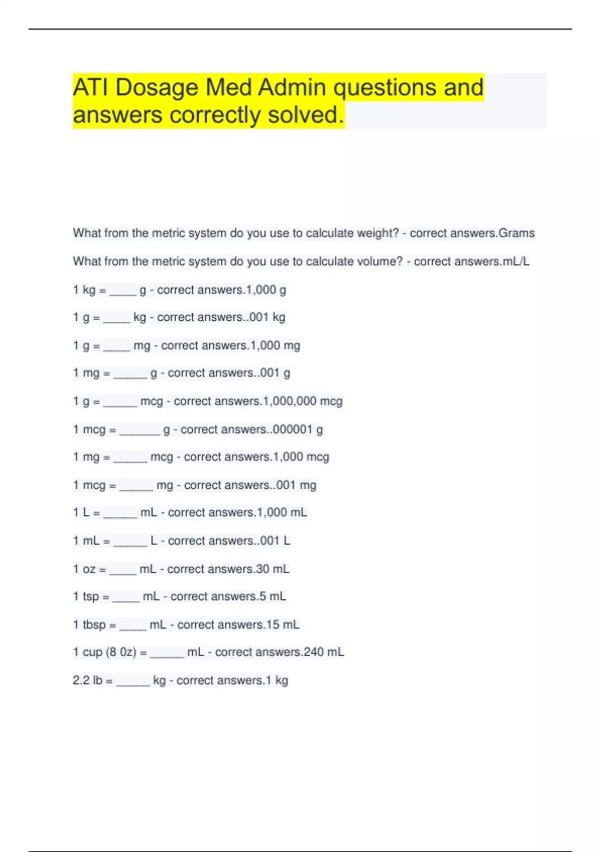 ATI Dosage Med Admin questions and answers correctly solved. What from the metric system do you use to calculate weight? - correct answers.Grams What from the metric system do you use to calculate volume? - correct answers.mL/L 1 kg = ____ g - correct answers.1,000 g 1 g = ____ kg - correct answers..001 kg 1 g = ____ mg - correct answers.1,000 mg 1 mg = _____ g - correct answers..001 g 1 g = _____ mcg - correct answers.1,000,000 mcg 1 mcg = ______ g - correct answers..000001 g 1 mg = _____ mcg - correct answers.1,000 mcg 1 mcg = _____ mg - correct answers..001 mg 1 L = _____ mL - correct answers.1,000 mL 1 mL = _____ L - correct answers..001 L 1 oz = ____ mL - correct answers.30 mL 1 tsp = ____ mL - correct answers.5 mL 1 tbsp = ____ mL - correct answers.15 mL 1 cup (8 0z) = _____ mL - correct answers.240 mL 2.2 lb = _____ kg - correct answers.1 kg