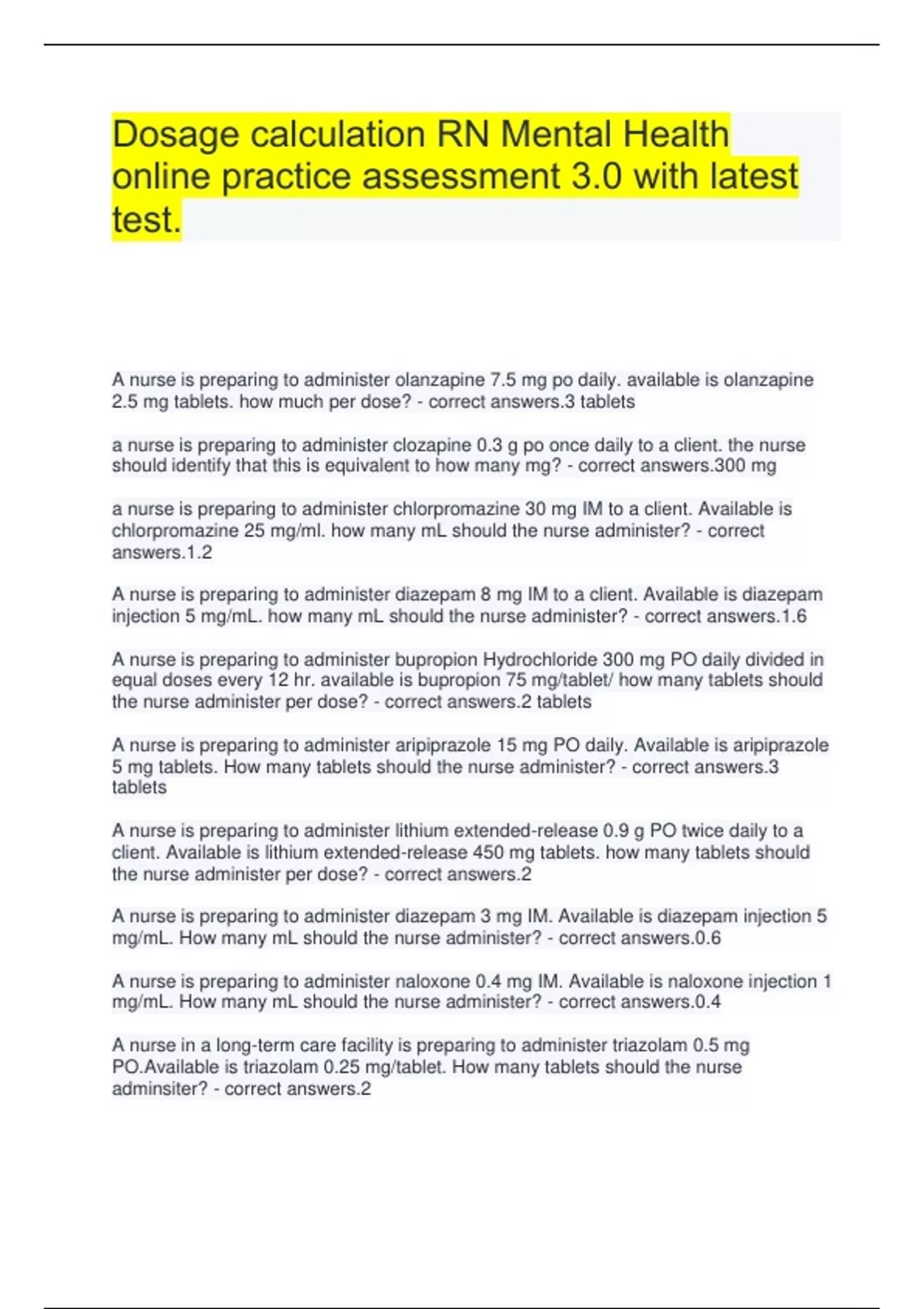 Dosage calculation RN Mental Health online practice assessment 3.0 with latest test.