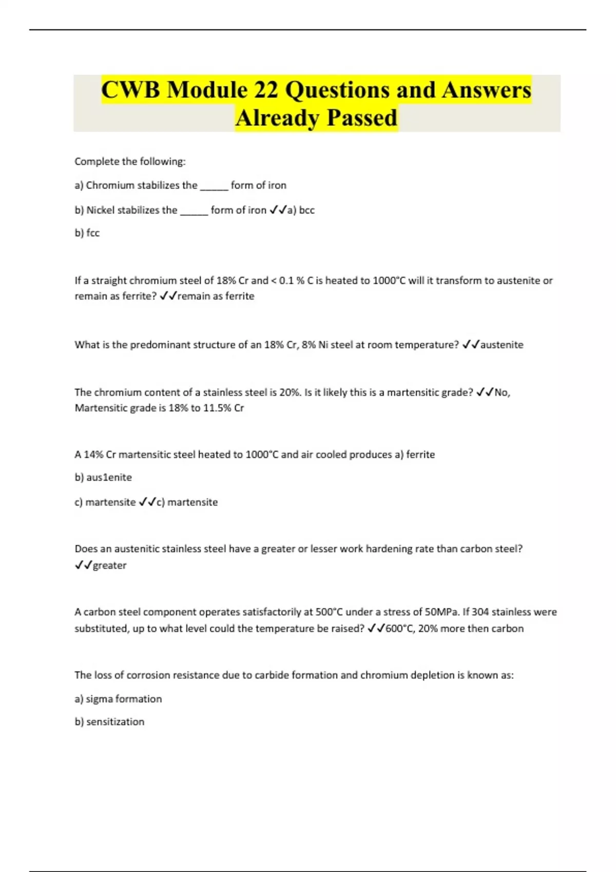 Complete the following: a) Chromium stabilizes the _____ form of iron b) Nickel stabilizes the _____ form of iron a) bcc b) fcc If a straight chromium steel of 18% Cr and < 0.1 % C is heated to 1000°C will it transform to austenite or remain as ferrite? remain as ferrite What is the predominant structure of an 18% Cr, 8% Ni steel at room temperature? austenite The chromium content of a stainless steel is 20%. Is it likely this is a martensitic grade? No, Martensitic grade is 18% to 11.5% Cr A 14% Cr martensitic steel heated to 1000°C and air cooled produces a) ferrite b) aus1enite c) martensite c) martensite