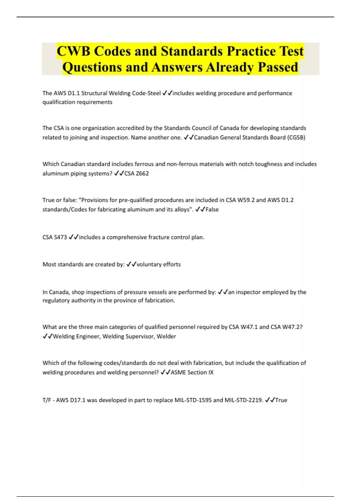 CWB Codes and Standards Practice Test Questions and Answers Already Passed