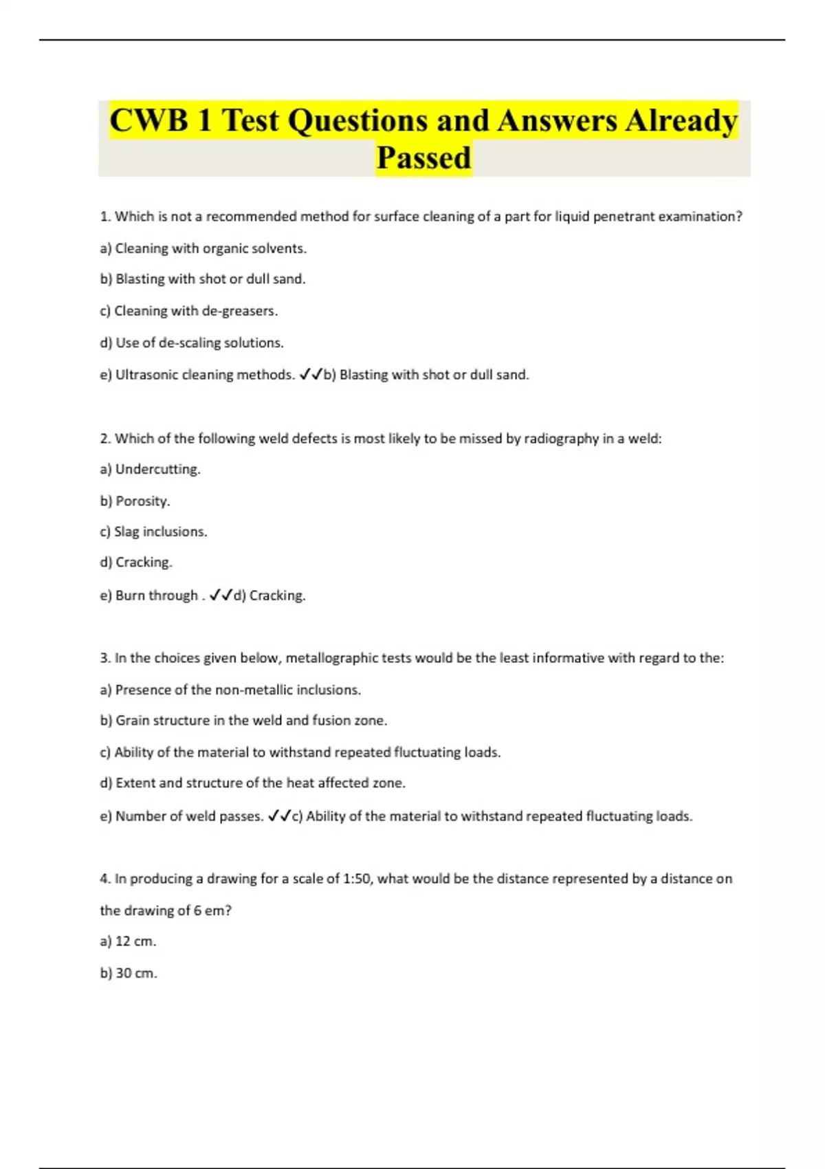 1. Which is not a recommended method for surface cleaning of a part for liquid penetrant examination? a) Cleaning with organic solvents. b) Blasting with shot or dull sand. c) Cleaning with de-greasers. d) Use of de-scaling solutions. e) Ultrasonic cleaning methods. b) Blasting with shot or dull sand. 2. Which of the following weld defects is most likely to be missed by radiography in a weld: a) Undercutting. b) Porosity. c) Slag inclusions. d) Cracking. e) Burn through . d) Cracking.