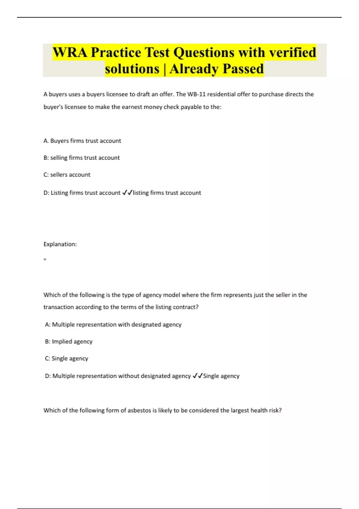 wra practice test questions with verified solution