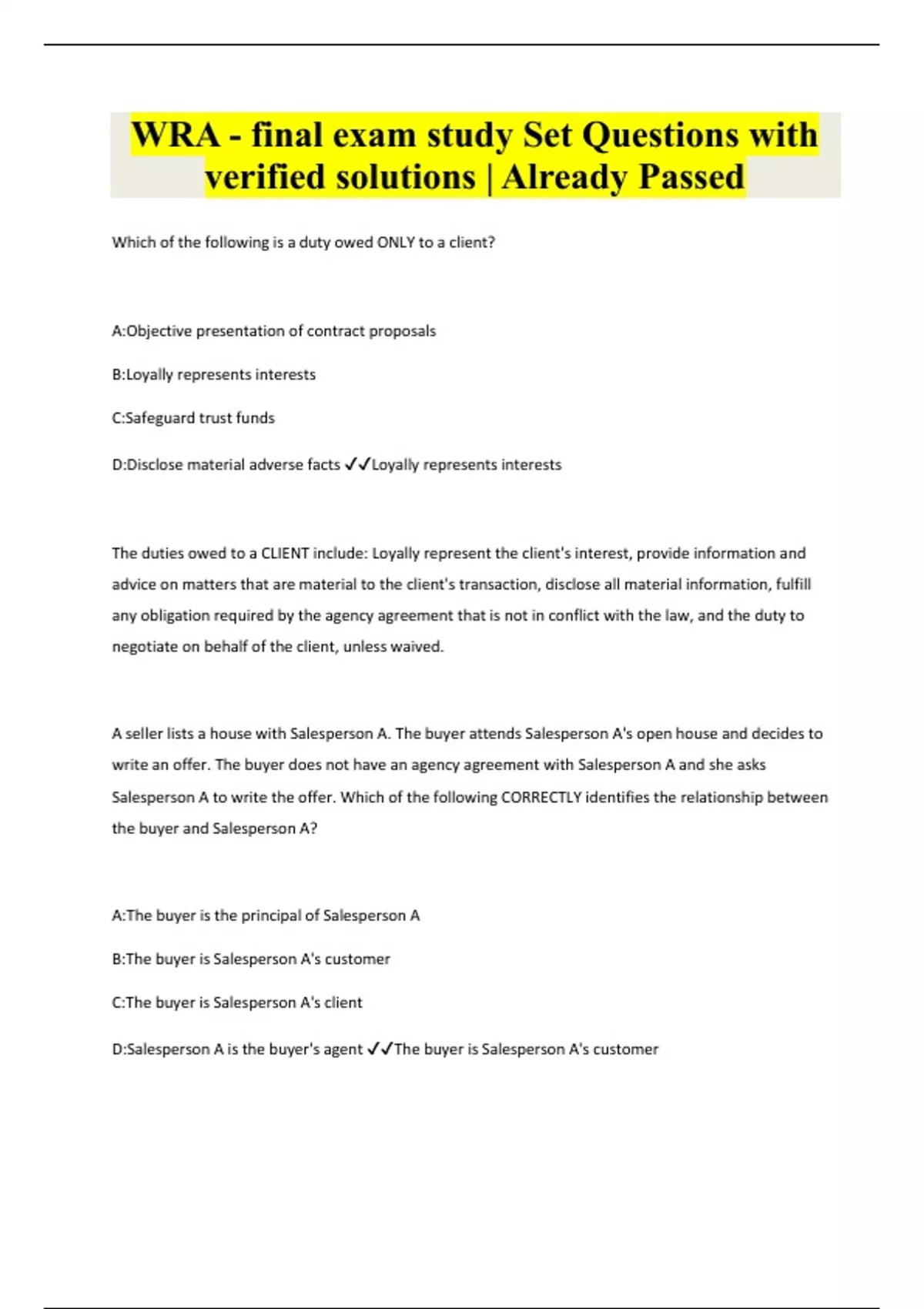 WRA - final exam study Set Questions with verified solutions | Already Passed