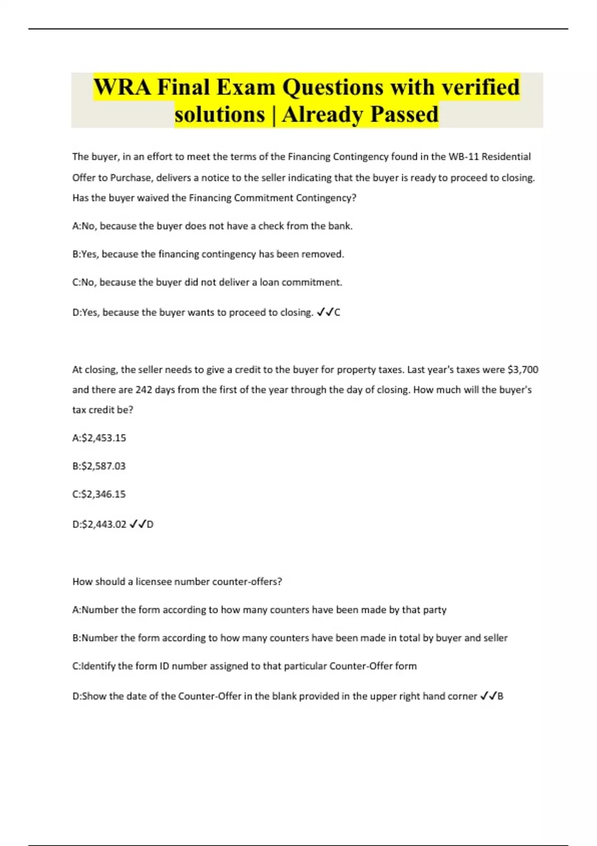 The buyer, in an effort to meet the terms of the Financing Contingency found in the WB-11 Residential Offer to Purchase, delivers a notice to the seller indicating that the buyer is ready to proceed to closing. Has the buyer waived the Financing Commitment Contingency? A:No, because the buyer does not have a check from the bank. B:Yes, because the financing contingency has been removed. C:No, because the buyer did not deliver a loan commitment. D:Yes, because the buyer wants to proceed to closing. C At closing, the seller needs to give a credit to the buyer for property taxes. Last year's taxes were $3,700 and there are 242 days from the first of the year through the day of closing. How much will the buyer's tax credit be? A:$2,453.15 B:$2,587.03 C:$2,346.15 D:$2,443.02