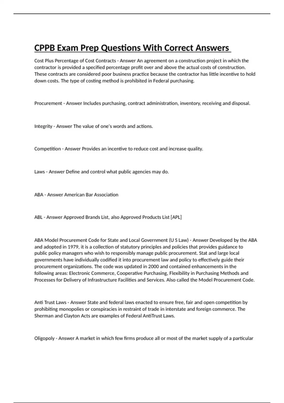 Cost Plus Percentage of Cost Contracts - Answer An agreement on a construction project in which the contractor is provided a specified percentage profit over and above the actual costs of construction. These contracts are considered poor business practice because the contractor has little incentive to hold down costs. The type of costing method is prohibited in Federal purchasing. Procurement - Answer Includes purchasing, contract administration, inventory, receiving and disposal. Integrity - Answer The value of one's words and actions. Competition - Answer Provides an incentive to reduce cost and increase quality. Laws - Answer Define and control what public agencies may do. ABA - Answer American Bar Association