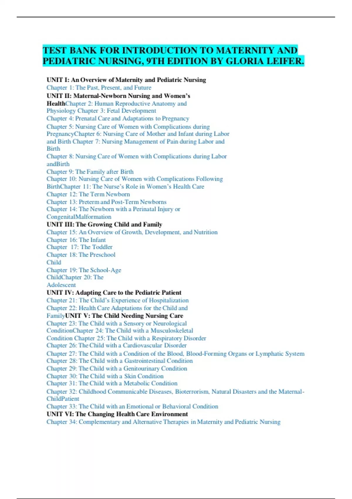 TEST BANK FOR INTRODUCTION TO MATERNITY AND PEDIATRIC NURSING, 9TH EDITION BY GLORIA LEIFER.