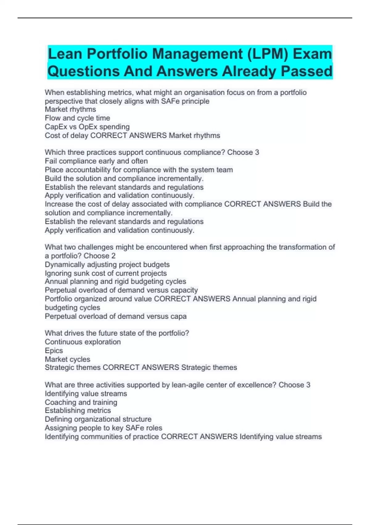 Lean Portfolio Management (LPM) Exam Questions And Answers Already Passed