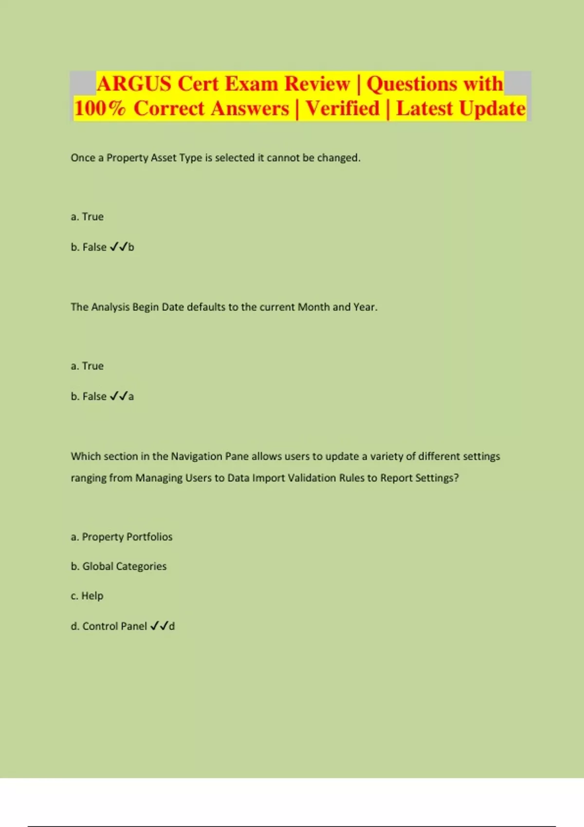 Once a Property Asset Type is selected it cannot be changed. a. True b. False b The Analysis Begin Date defaults to the current Month and Year. a. True b. False a Which section in the Navigation Pane allows users to update a variety of different settings ranging from Managing Users to Data Import Validation Rules to Report Settings? a. Property Portfolios b. Global Categories c. Help d. Control Panel d