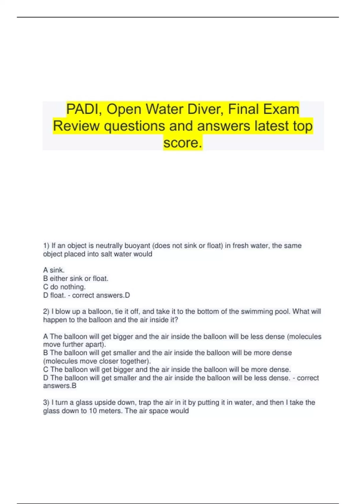 PADI, Open Water Diver, Final Exam Review questions and answers latest top score. 1) If an object is neutrally buoyant (does not sink or float) in fresh water, the same object placed into salt water would A sink. B either sink or float. C do nothing. D float. - correct answers.D 2) I blow up a balloon, tie it off, and take it to the bottom of the swimming pool. What will happen to the balloon and the air inside it? A The balloon will get bigger and the air inside the balloon will be less dense (molecules move further apart). B The balloon will get smaller and the air inside the balloon will be more dense (molecules move closer together). C The balloon will get bigger and the air inside the balloon will be more dense. D The balloon will get smaller and the air inside the balloon will be less dense. - correct answers.B 3) I turn a glass upside down, trap the air in it by putting it in water, and then I take the glass down to 10 meters. The air space would A become half the size it was at the surface. B not change in size. C become 1/3 the size it was at the surface. D become 2/3 the size it was at the surface. - correct answers.A 4) If I am not able to equalize (clear) my body air spaces, it may be because I have A seasickness. B heart disease and high blood pressure. C a cold, allergy or another medical problem. D anxiety. - correct answers.C 5) If my ears or sinuses hurt while I am descending (going down), it usually means A my air spaces are equalized. B my mask strap is too tight. C I am feeling a squeeze and need to equalize. D my mask is too small. - correct answers.C 6) The best place for me to position an alternate air source is A loose by my side so I can find it fast. B in the triangle area formed by my chin and the lower corners of my rib cage. C to the base of my cylinder. D to the back of my BCD between my shoulder blades and waist. - correct answers.B 7) Lung overexpansion injuries can be caused by A scuba diving without a buddy. B continuing a dive when not properly weighted. C not drinking enough water before scuba diving. D holding my breath while scuba diving. - correct answers.D 8) If my cylinder of air lasts 60 minutes while I am at the surface breathing normally, assuming all else is the same, how long will it last at 20 meters breathing normally? A 60 minutes B 20 minutes C 15 minutes D 12 minutes - correct answers.B 9) How often should I take my scuba cylinder to be visually inspected by my dive center? A Once a year. B Once every two years.