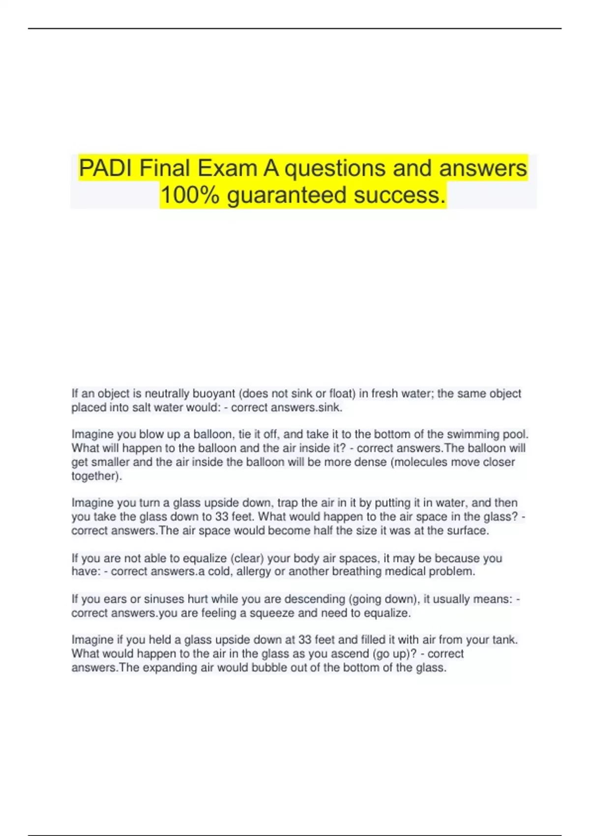 PADI Final Exam A questions and answers 100% guaranteed success. If an object is neutrally buoyant (does not sink or float) in fresh water; the same object placed into salt water would: - correct . Imagine you blow up a balloon, tie it off, and take it to the bottom of the swimming pool. What will happen to the balloon and the air inside it? - correct answers.The balloon will get smaller and the air inside the balloon will be more dense (molecules move closer together). Imagine you turn a glass upside down, trap the air in it by putting it in water, and then you take the glass down to 33 feet. What would happen to the air space in the glass? - correct answers.The air space would become half the size it was at the surface. If you are not able to equalize (clear) your body air spaces, it may be because you have: - correct answers.a cold, allergy or another breathing medical problem. If you ears or sinuses hurt while you are descending (going down), it usually means: - correct are feeling a squeeze and need to equalize. Imagine if you held a glass upside down at 33 feet and filled it with air from your tank. What would happen to the air in the glass as you ascend (go up)? - correct answers.The expanding air would bubble out of the bottom of the glass. Holding your breath while scuba diving can: - correct answers.Cause lung injuries, push air into the blood stream and chest area, and lead to life threatening injuries. If your tank of air lasts 60 minutes while you are at the surface breathing normally, how long will it last at 66 feet breathing normally? - correct answers.20 minutes How often should you take your suva tank to be visually inspected by your dive center? - correct answers.Once a year How can you identify a DIN tank valve from a yoke valve? - correct answers.The DIN valve has a threaded opening to screw the regulator into. What can you do to properly care for a scuba tank? - correct answers.Do not use all the air in the tank. Underwater things look ________. When you look at things underwater they often seem_______ than when you look at them on the surface. - correct r, nearer _______ travels faster in water. This is why you cannot use it to tell direction very well. - correct answers.Sound How should you move under water? - correct answers.Slowly and steadily If you work too hard and find it difficult to breathe underwater, you should: - correct all activity and rest, hold onto something for support, if possible. As you descend (go down) towards the bottom, you wet suit will: - correct ess (become smaller in thickness) from water pressure and you will lose buoyancy and warmth the deeper you go. You know you are properly weighted for diving if you: - correct at eye level holding a normal breath of air with an empty BCD. If you and your buddy were separated underwater what would you generally do? - correct answers.Search for a minute underwater and then go up to find your buddy. You are most likely to become confused about which way is up or down ______. This can happen because _______. - correct midwater, you cannot see the surface or the bottom. Imagine you feel a mild current at the start of your dive. How should you begin the dive? - correct answers.Dive against or into the current. What the bottom is made of can cause big changes in: - correct ility