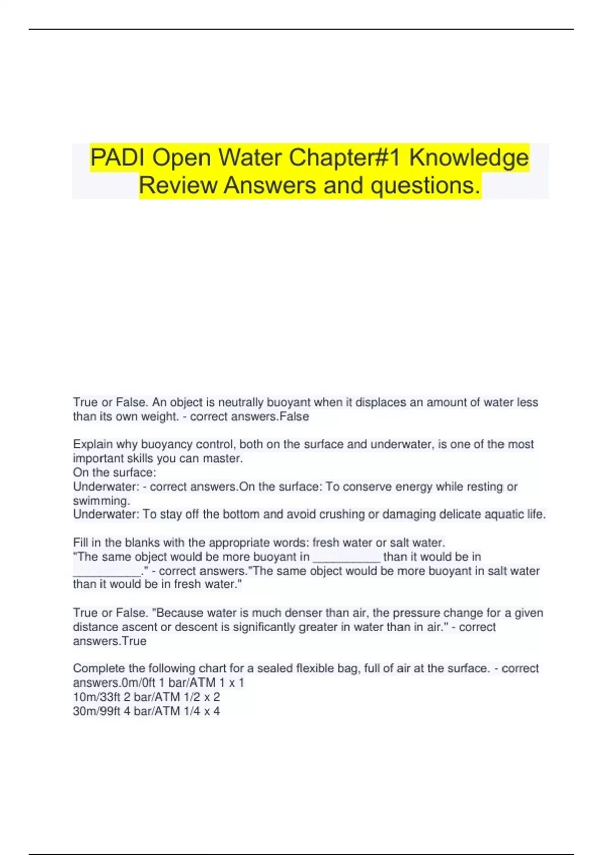 PADI Open Water Chapter#1 Knowledge Review Answers and questions. True or False. An object is neutrally buoyant when it displaces an amount of water less than its own weight. - correct answers.False Explain why buoyancy control, both on the surface and underwater, is one of the most important skills you can master. On the surface: Underwater: - correct answers.On the surface: To conserve energy while resting or swimming. Underwater: To stay off the bottom and avoid crushing or damaging delicate aquatic life. Fill in the blanks with the appropriate words: fresh water or salt water. "The same object would be more buoyant in __________ than it would be in __________." - correct answers."The same object would be more buoyant in salt water than it would be in fresh water." True or False. "Because water is much denser than air, the pressure change for a given distance ascent or descent is significantly greater in water than in air.'' - correct answers.True Complete the following chart for a sealed flexible bag, full of air at the surface. - correct answers.0m/0ft 1 bar/ATM 1 x 1 10m/33ft 2 bar/ATM 1/2 x 2 30m/99ft 4 bar/ATM 1/4 x 4