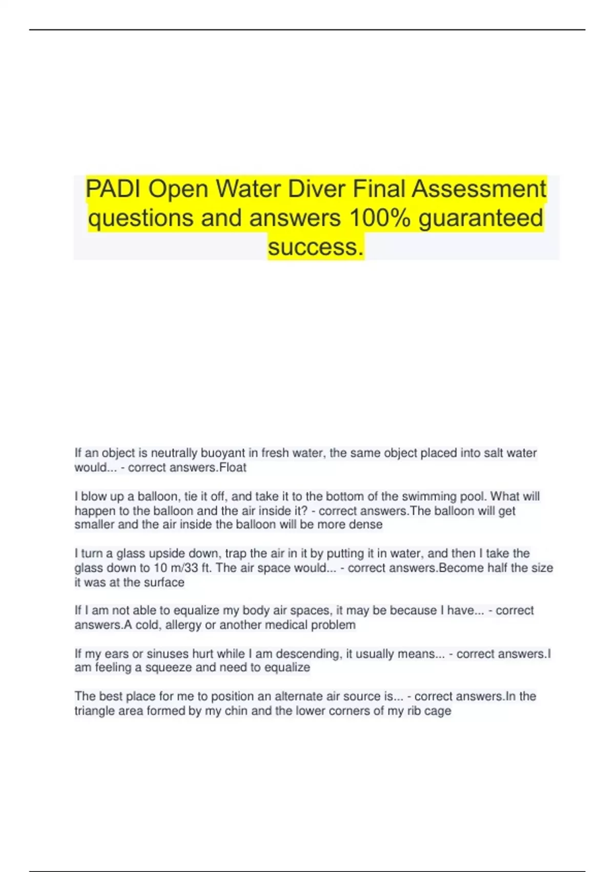 PADI Open Water Diver Final Assessment questions and answers 100% guaranteed success. If an object is neutrally buoyant in fresh water, the same object placed into salt water would... - correct answers.Float I blow up a balloon, tie it off, and take it to the bottom of the swimming pool. What will happen to the balloon and the air inside it? - correct answers.The balloon will get smaller and the air inside the balloon will be more dense I turn a glass upside down, trap the air in it by putting it in water, and then I take the glass down to 10 m/33 ft. The air space would... - correct answers.Become half the size it was at the surface If I am not able to equalize my body air spaces, it may be because I have... - correct answers.A cold, allergy or another medical problem If my ears or sinuses hurt while I am descending, it usually means... - correct answers.I am feeling a squeeze and need to equalize The best place for me to position an alternate air source is... - correct answers.In the triangle area formed by my chin and the lower corners of my rib cage Lung overexpansion injuries can be caused by... - correct answers.Holding my breath while scuba diving If my cylinder of air lasts 60 minutes while I am at the surface breathing normally, assuming all else is the same, how long will it last at 20 m/66 ft breathing normally? - correct answers.20 minutes How often should I take my scuba cylinder to be visually inspected by my dive center? - correct answers.Once a year The difference between DIN values and yoke valves is that DIN valves... - correct answers.Have threaded openings to screw the regulator into Which of the following is not part of proper care for my scuba cylinder? - correct answers.Keep some air in it Refer to the regulator picture on the right. Each regulator part has a number next to it. Please choose the correct numeric order from the choices below - correct answers.1. Regulator first stage, 2. regulator second stage, 3. alternate air source second stage, 4. low pressure inflator hose for the BCD, 5. instrument console/gauges/computer When I look at things underwater they often seem _____ than they look on the surface - correct answers.Larger and/or nearer _____ travels faster in water than it does in air. This is why you cannot easily tell where it comes from - correct answers.Sound Unless there are laws that say differently, I should stay within _____ of my dive flag - correct answers.15 m/50 ft If I work too hard and find it difficult to breathe underwater, I should... - correct answers.Stop all activity and rest, holding onto something for support if possible As I descend, my wet suit will... - correct answers.Compress from water pressure, and I will lose buoyancy and warmth I know I am properly weighted for diving if I... - correct answers.Float at eye level while holding a normal breath of air and with an empty BCD Choose the best answer for the signal shown from the choices provided - correct answers.Stop, hold it, stay there Choose the best answer for the signal shown from the choices provided - correct answers.Something is wrong