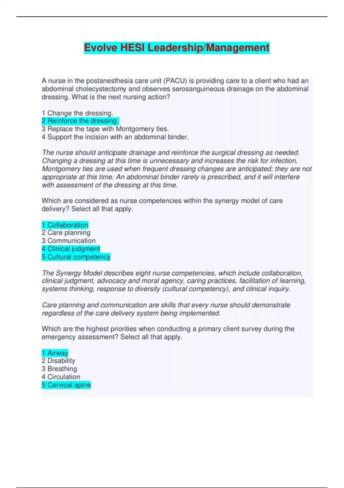Evolve HESI Leadership/Management - Questions, Answers and Rationales A nurse in the postanesthesia care unit (PACU) is providing care to a client who had an abdominal cholecystectomy and observes serosanguineous drainage on the abdominal dressing. What is the next nursing action? 1 Change the dressing. 2 Reinforce the dressing. 3 Replace the tape with Montgomery ties. 4 Support the incision with an abdominal binder. The nurse should anticipate drainage and reinforce the surgical dressing as needed. Changing a dressing at this time is unnecessary and increases the risk for infection. Montgomery ties are used when frequent dressing changes are anticipated; they are not appropriate at this time. An abdominal binder rarely is prescribed, and it will interfere with assessment of the dressing at this time. Which are considered as nurse competencies within the synergy model of care delivery? Select all that apply. 1 Collaboration 2 Care planning 3 Communication 4 Clinical judgment 5 Cultural competency The Synergy Model describes eight nurse competencies, which include collaboration, clinical judgment, advocacy and moral agency, caring practices, facilitation of learning, systems thinking, response to diversity (cultural competency), and clinical inquiry. Care planning and communication are skills that every nurse should demonstrate regardless of the care delivery system being implemented. Which are the highest priorities when conducting a primary client survey during the emergency assessment? Select all that apply. 1 Airway 2 Disability 3 Breathing 4 Circulation 5 Cervical spine Airway and stabilization of the cervical spine are the top priorities when conducting a primary client survey during the emergency assessment. The nurse will then focus on breathing, circulation, and disability. The charge nurse is identifying tasks for staff caring for clients using functional nursing. Which tasks should be assigned to the licensed practical/licensed vocational nurse (LPN/LVN)? Select all that apply. 1 Showering two clients after breakfast 2 Administering topical and oral medications 3 Providing discharge instructions to three clients 4 Measuring capillary blood glucose level for five clients 5 Identifying nursing diagnoses after analyzing collected data Task assignments are made according to scope of practice. For the LPN/LVN, the scope of practice would include administering topical and oral medications and measuring capillary blood glucose levels. Showering would be a task assigned to unlicensed assistive personnel (UAP). Providing discharge instructions and identifying nursing diagnoses would be assigned to the registered nurse (RN). The case manager notes that a client's hospitalization is being prolonged for one day because of an unexpected adverse medication reaction. What action should the case manager take? 1 Add the extra day into the pathway. 2 Document the reaction as a variance. 3 Change all uses of the pathway to add the extra day. 4 Prepare documentation to submit to Medicare about the extra day. If a client's progress deviates from the normal path, a variance is indicated. A variance is anything that occurs to alter the client's progress through the normal critical path. The reason(s) for the variance should be analyzed and the care revised to meet the needs of the clients. An extra day is not added into the pathway and all uses of the pathway are not changed by adding an extra day based on this single variance. There is no evidence to support that the case manager needs to submit documentation to Medicare about the extra day. Which skills are essential for the nurse who is setting priorities for client care? Select all that apply. 1 Evaluation 2 Assessment 3 Critical thinking 4 Case management 5 Clinical decision-making Essential skills for the nurse who is setting priorities for client care include assessment, critical thinking, and clinical decision-making. Evaluation and case management are nursing skills; however, these are not essential for setting priorities. The nurse is performing resuscitation interventions for airway, breathing, and circulation as part of a primary survey in a client. Which order of actions should the nurse follow for this client? 1. Use direct pressure for external bleeding. 2. Prepare for chest decompression if needed. 3. Assess breath sounds and respiratory effort. 4. Establish airway by positioning, suctioning, and oxygen as needed. 5. Maintain vascular access using a large-bore catheter. 1.Establish airway by positioning, suctioning, and oxygen as needed. 2.Assess breath sounds and respiratory effort. 3.Prepare for chest decompression if needed. 4.Maintain vascular access using a large-bore catheter. 5.Use direct pressure for external bleeding. The primary survey includes assessment of airway/cervical spine, breathing, circulation, disability, and exposure. First, the nurse should establish airway patency by positioning, suctioning, and providing oxygen as needed. Assess breath sounds and respiratory effort and provide chest decompression if needed in order to assess breathing. Maintain vascular access using a large-bore catheter and use direct pressure for any external bleeding. What is the priority nursing care for a client who is prescribed hydroxychloroquine (Plaquenil)? 1 Teaching the client to report blurred vision 2 Teaching the client to report signs of infection 3 Teaching the client to report shortness of breath 4 Teaching the client to report stomach discomfort Plaquenil is a hydroxychloroquine used to treat rheumatoid arthritis. The adverse effect of Plaquenil is retinal damage; therefore, a client on Plaquenil is taught to report blurred vision. A client on steroids is taught to report signs of infection. A client on infliximab is taught to report shortness of breath. Plaquenil causes mild stomach discomfort, which is normal and is not related to priority nursing care.