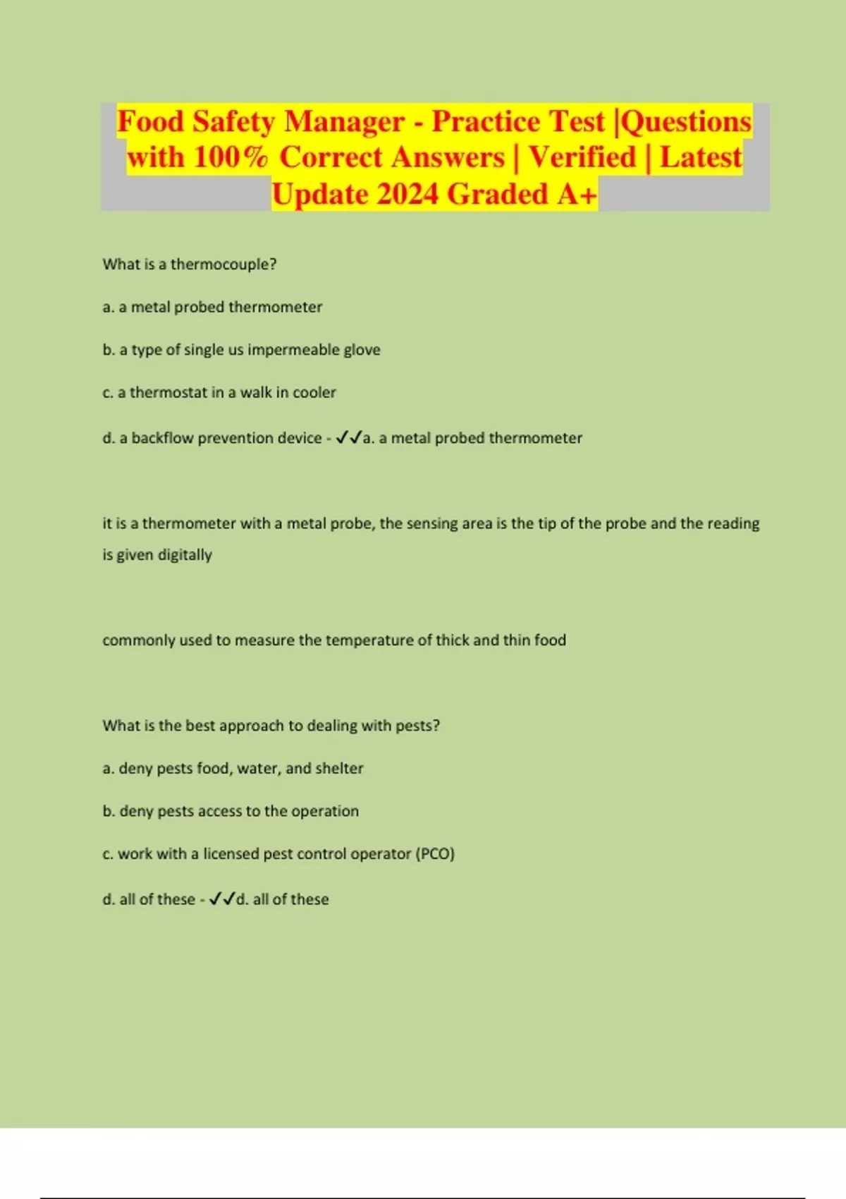 Food Safety Manager - Practice Test |Questions with 100% Correct Answers | Verified | Latest Update 2024 Graded A+